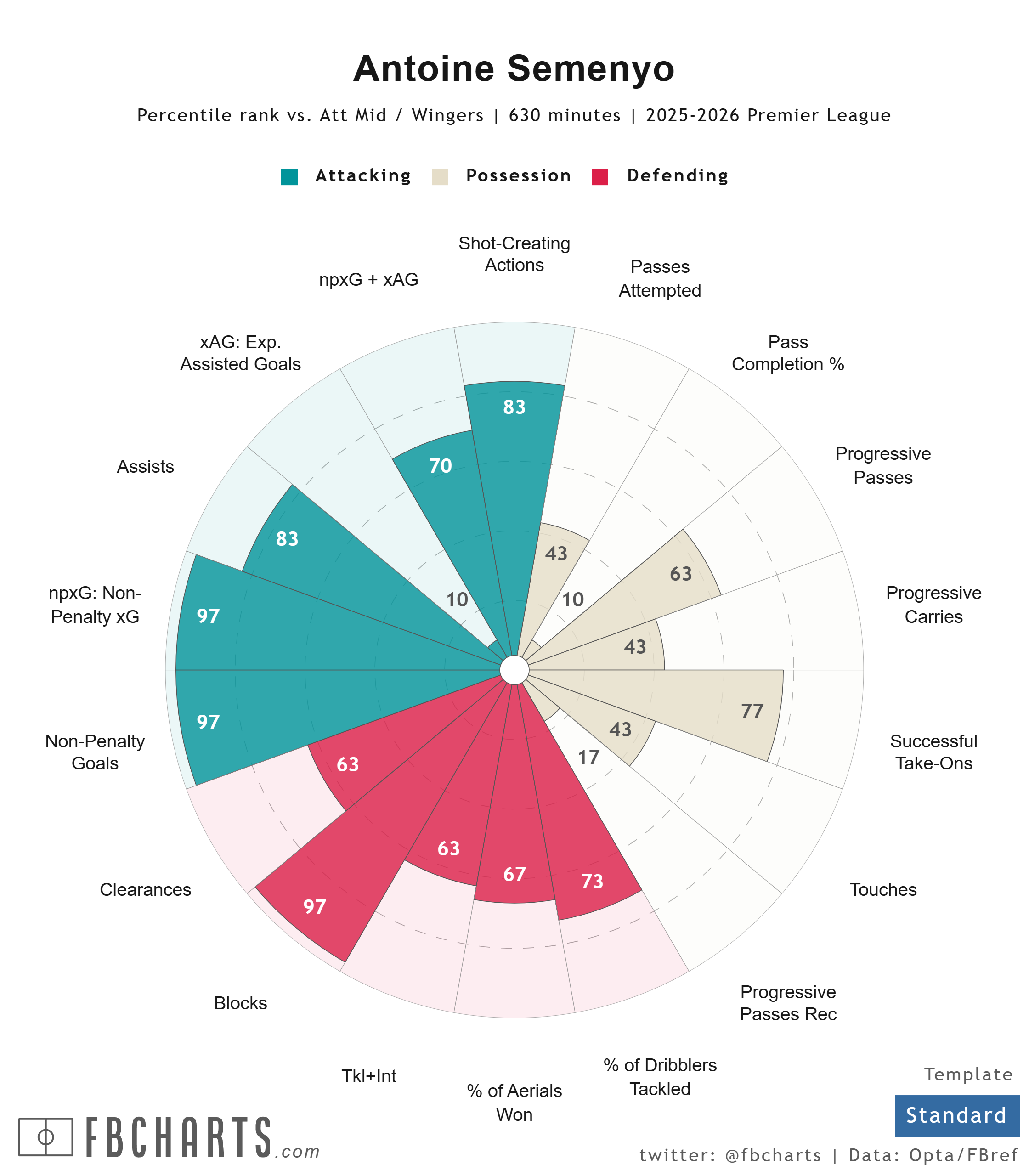 Здесь есть небольшая проблема в том, что сравнение идет еще и с полузащитниками, и поэтому кажется, что Семеньо заметно слабее в передачах. Если сравнивать его с форвардами, то он намного лучше остальных нападающих, но это было бы тоже нечестно.