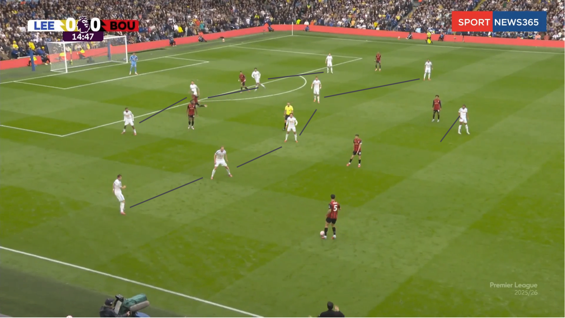 И Уортон этим пользовался, делая забросы на нападающих. Вообще такие полузащитники, как Уортон и Тонали, очень полезны против прессинга «Борнмута». Они хорошо сохраняют мяч под давлением и продвигают его вперед с помощью продвигающего рывка или передачи.