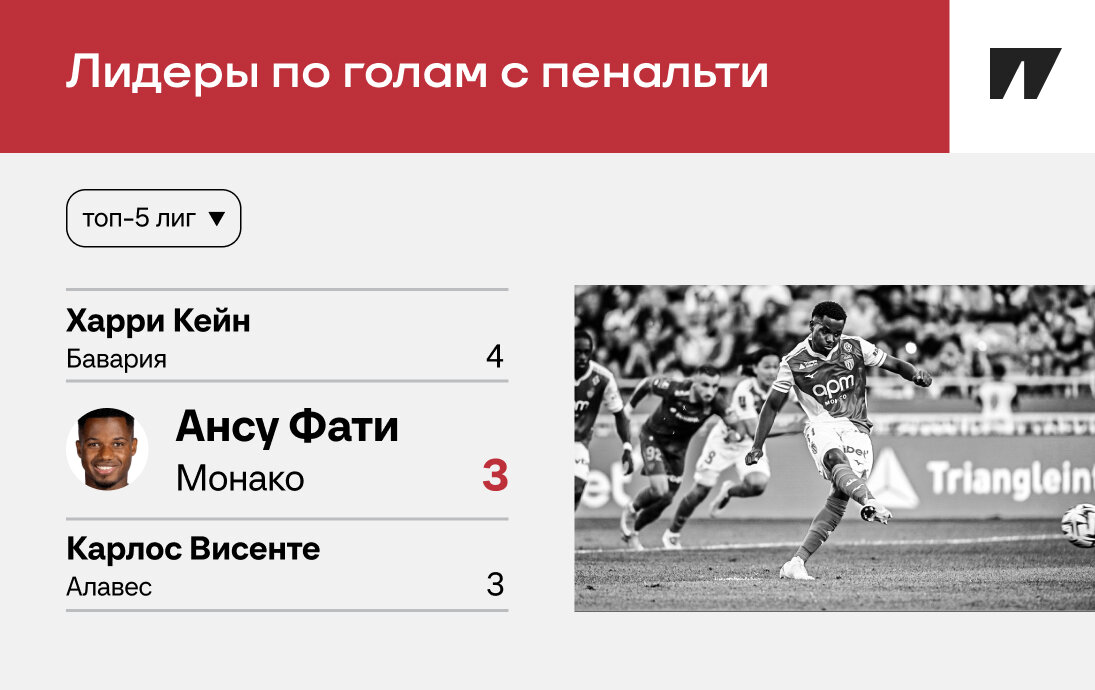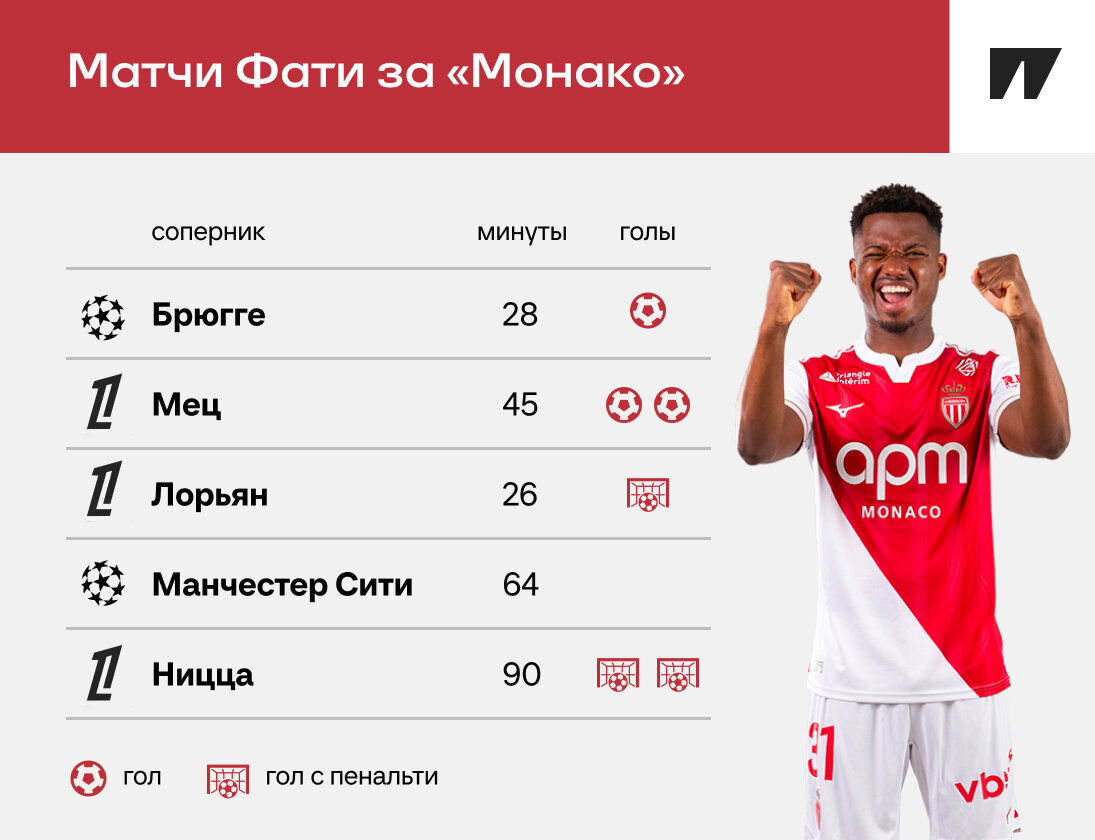И все-таки даже без учета пенальти результативность хороша, Фати забил еще в Лиге чемпионов против «Брюгге» (не 11-метровый). Если считаем только голы с игры, Ансу забивает за «Монако» каждые 84 минуты. Понятно, маленькая выборка, но зафиксировать голевой старт – почему нет? Пока только «Ман Сити» не пропустил от Фати.
