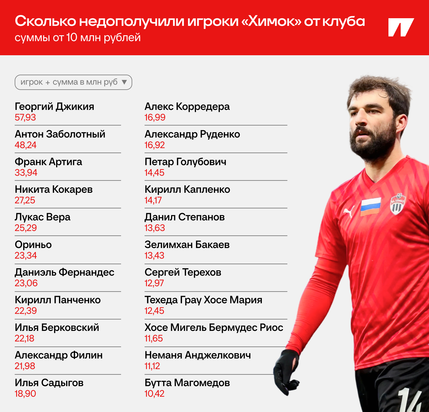 ● Как видим, здесь есть Зелимхан Бакаев и Александр Руденко, которые сейчас играют в «Локомотиве», или Александр Филин из «Балтики». Больше 14 млн должны Кириллу Капленко, который сыграл пять матчей за «Химки» в РПЛ. 11 млн клуб должен Немане Анджелковичу, у которого семь игр в чемпионате. Задолжали даже Илье Садыгову!
