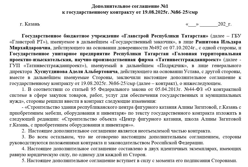 Изначальный контракт 19 августа заключался на строительство здания республиканского центра фигурного катания Алины Загитовой. Но в начале сентября стороны экстренно подписали дополнительное соглашение, в котором объект получил новое название «Центр фигурного катания, школа Алины Загитовой».