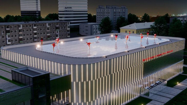 Планируются тренировочные залы с тренажерами для отработки эффектных элементов катания (прыжков, вращений и приземления), два зала хореографии, зал кардио, зал групповых занятий, раздевалки и, собственно, каток. В фойе и у ледовой площадки предусмотрены зоны ожидания для родителей, а в вестибюле запланировано кафе с панорамным остеклением.