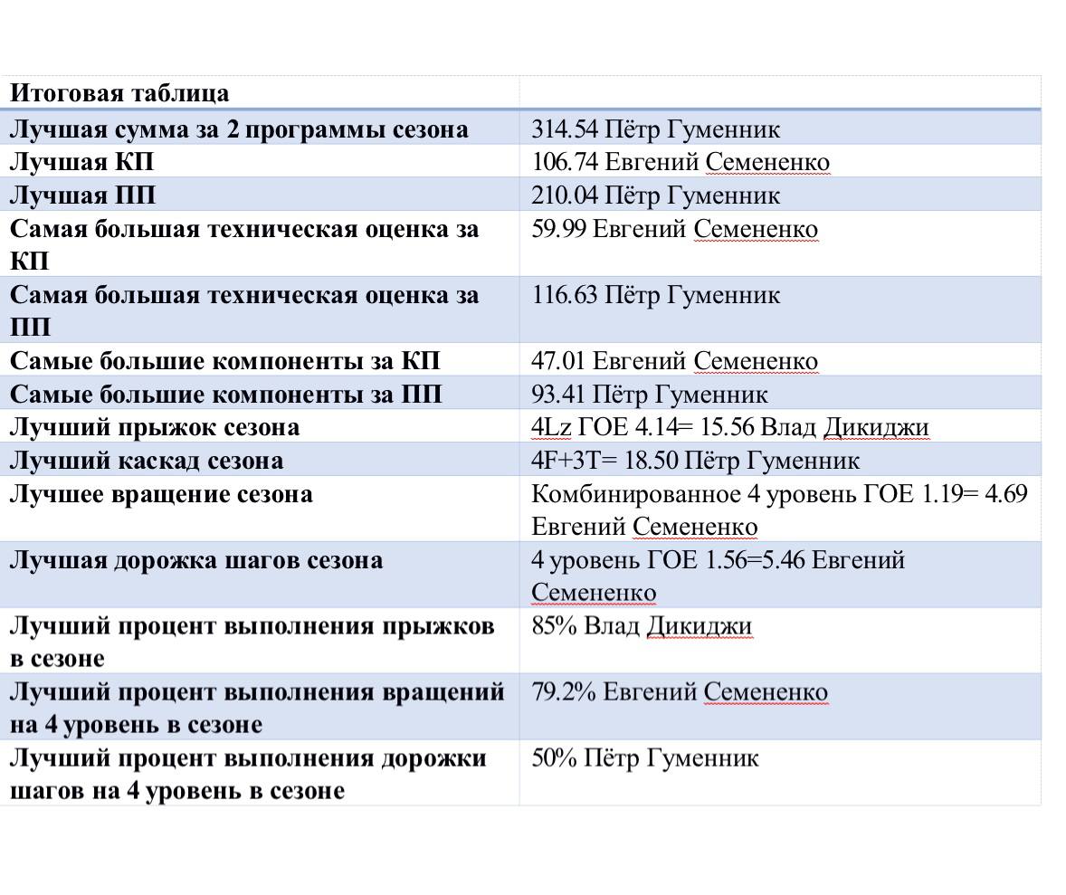 Подводя итоги выполнения элементов фигуристами претендовавшими на поездку на Олимпийскую квалификацию, стоит сказать, что Петр Гуменник выигрывает по 6 показателям. И его главным конкурентам по показателям переставленным в таблице является отнюдь не Владислав, а Евгений. При этом Марк не показал себя лучшим ни в одном из показателей.