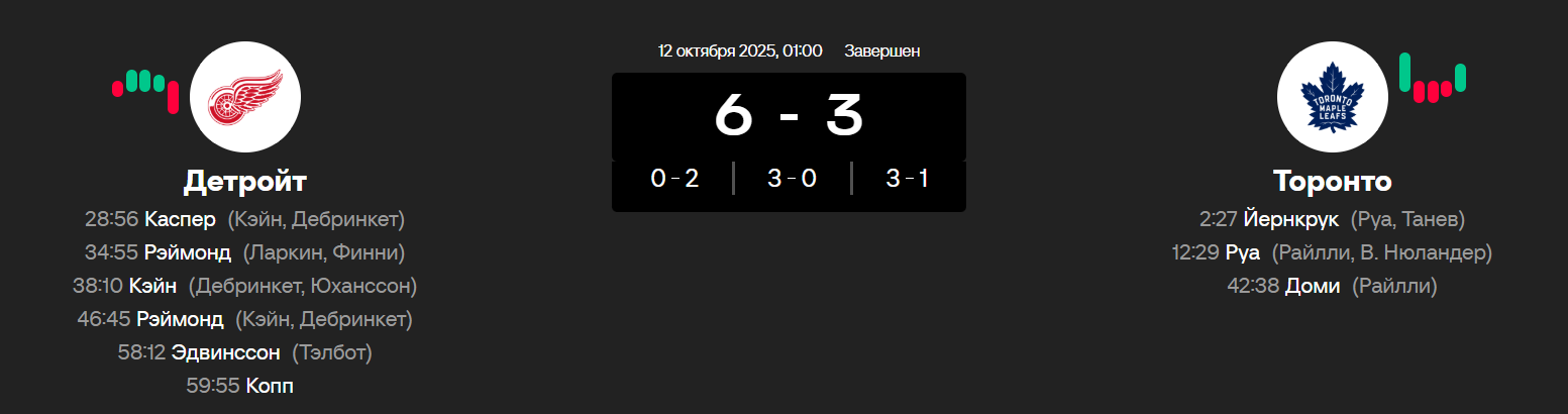 Оказалось, у состава и лично у хоккейного бога были другие планы. Вальяжными пробежками с открытым забралом, Детройт привез сам себе несколько выходов двух-трех канадских нападающих против одного защитника, после чего игра закончилась еще в первом периоде.