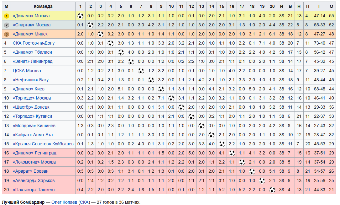 Таков итог 380 матчей юбилейного чемпионата 1963 года. Второй круг оказался более результативным чем первый (446 голов против 416).