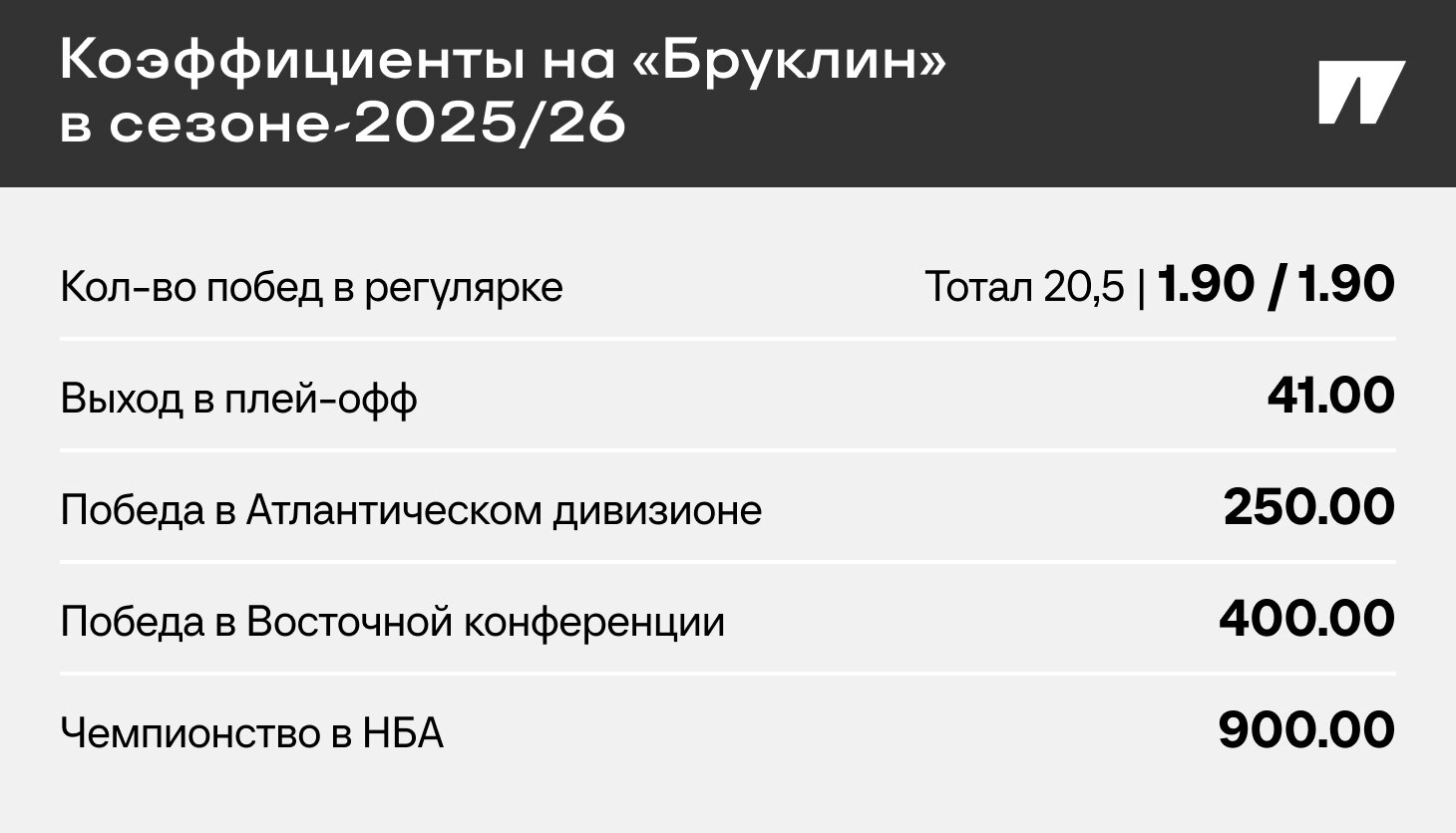В списке возможных победителей Восточной конференции «Бруклин» котируют вторым с конца. В линии на чемпионство НБА «Нетс» в группе главных аутсайдеров – вместе с «Вашингтоном», «Шарлотт» и «Ютой».