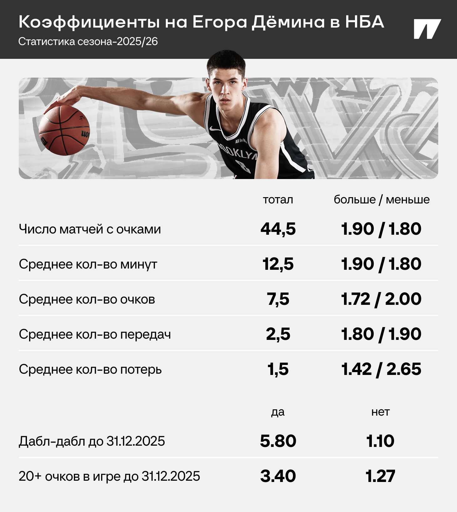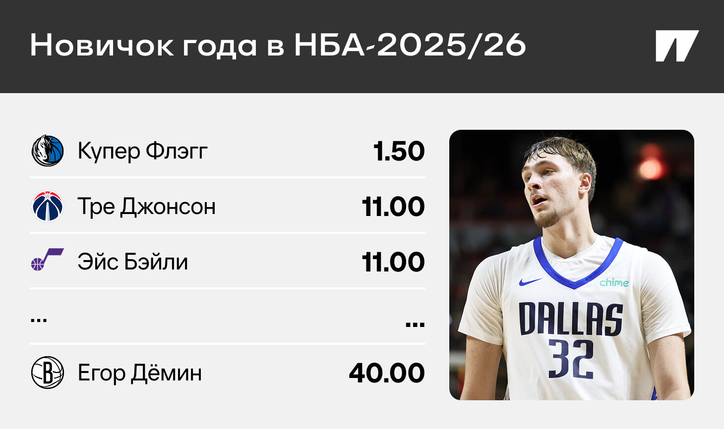 Егор Дёмин все ближе к дебюту в НБА – новый сезон стартует в ночь на 22 октября. Момент особенный: как проявит себя самый высокий пик в истории российского баскетбола? Ответ узнаем весной, а пока можно заглянуть в котировки – там есть подсказки от букмекеров.