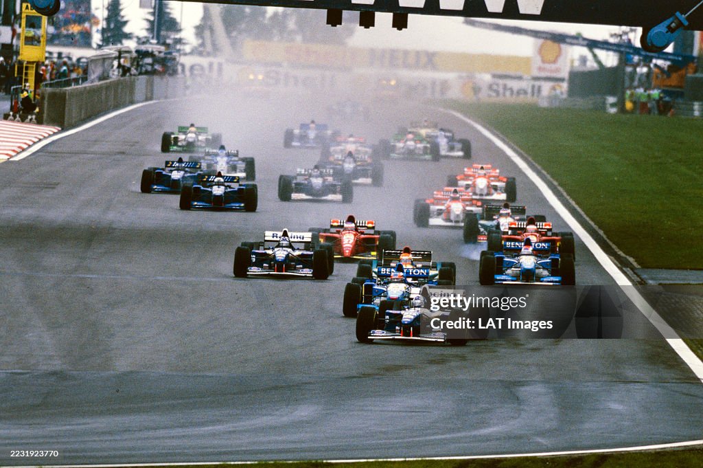 Култхарду пришлось использовать запасной болид «Уильямса», который был подготовлен для Хилла, так как Дэвид совершил вращение на своем прогревочном круге и заглох в процессе. Старт гонки был назначен на 14:00, но Папис заглох на своем «Футвоорк» во время процедуры стартовых огней, что привело к отмене старта. Новый старт был запланирован на 14:05. Многие команды стартовали на дождевых шинах, но «Феррари» и «Макларен» решили установить на свои болиды слики — шины для сухой погоды. Механики «Феррари» также увеличили клиренс и подняли уровень прижимной силы на машинах Алези и Бергера прямо на стартовой решетке, сделав их более конкурентоспособными в условиях влажной трассы.