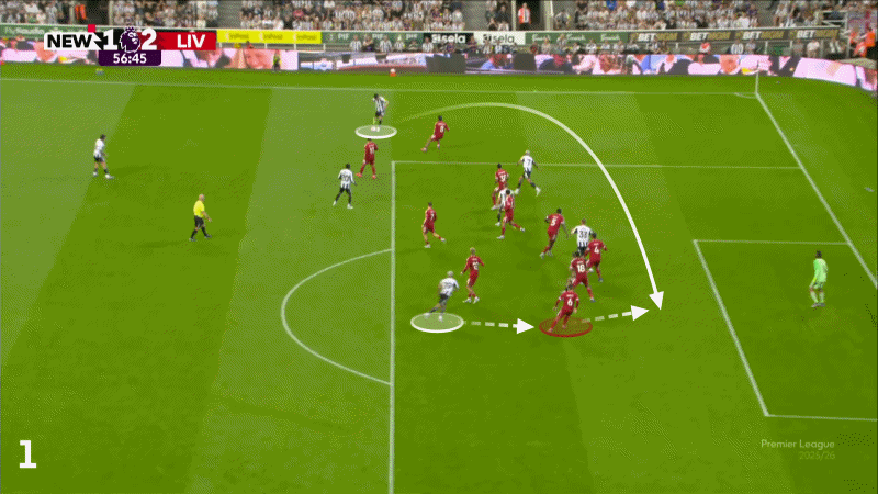 Неудачное начало матча против «Борнмута» на «Энфилде» задало тон, и 21-летний защитник стал виновником первого гола «Ньюкасла» после того, как не смог справиться с прострелом — да, вы уже догадались — на дальнюю штангу. Как показано ниже (второй кадр), Керкезу не удается полностью перехватить мяч, поскольку он проигрывает Бруно Гимарайншу в воздушном бою, который едва ли можно было выиграть.