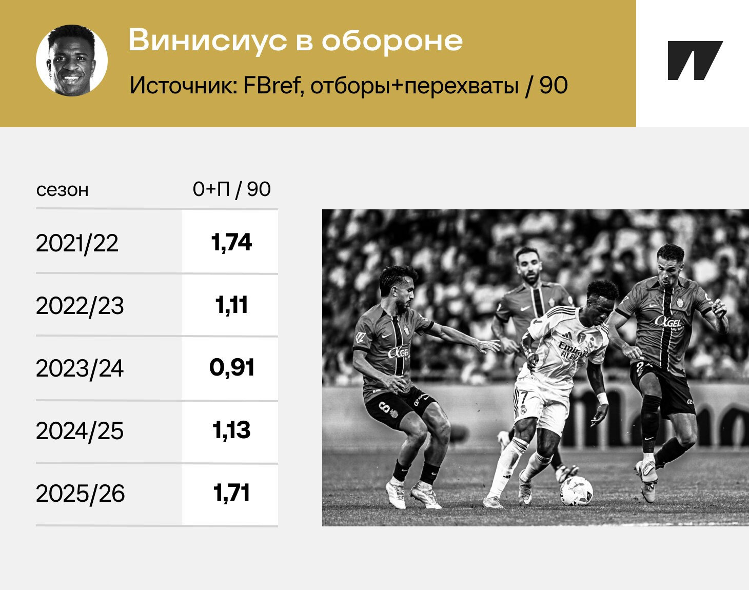 Косвенным индикатором вовлеченности Винисиуса в работу без мяча (и успешности в ней) служат отборы и перехваты.