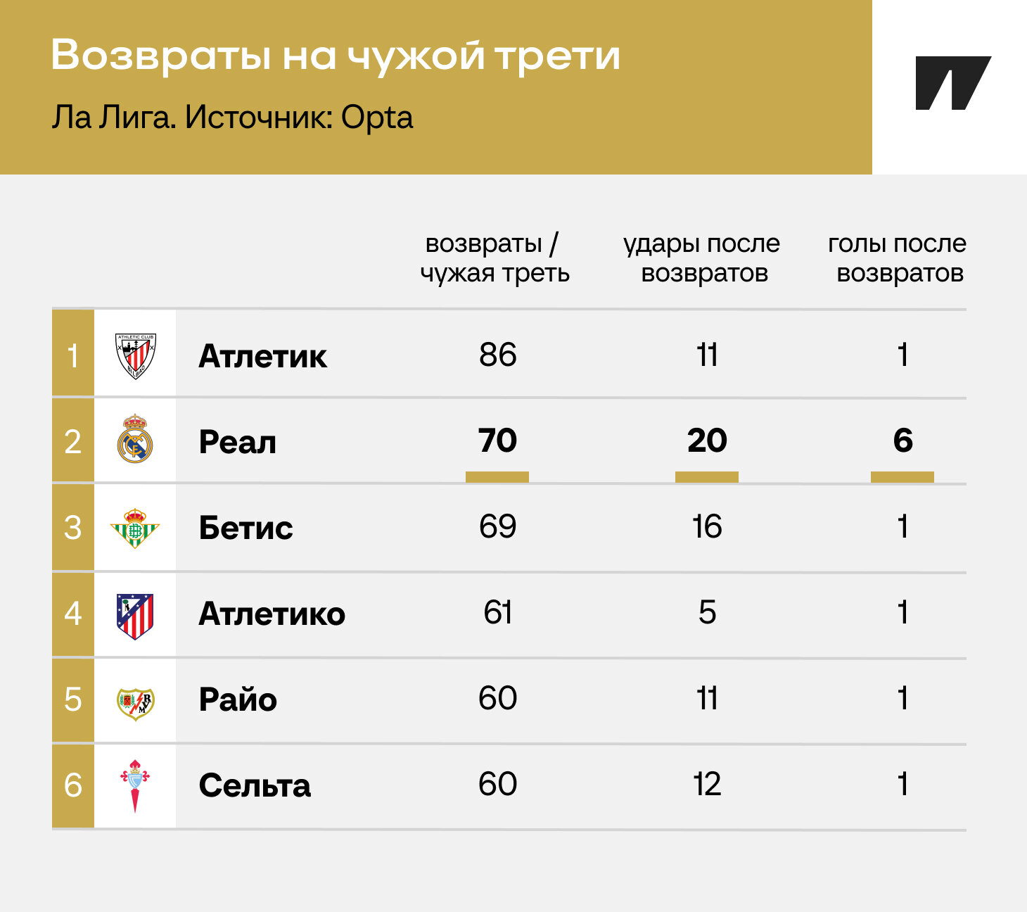 При этом моменты на открытом пространстве не ушли из игры «Реала» полностью. Просто они возникают иным образом – через прессинг. По голам из ситуаций после возврата мяча на чужой трети «Мадрид» с отрывом лидирует в Ла Лиге.