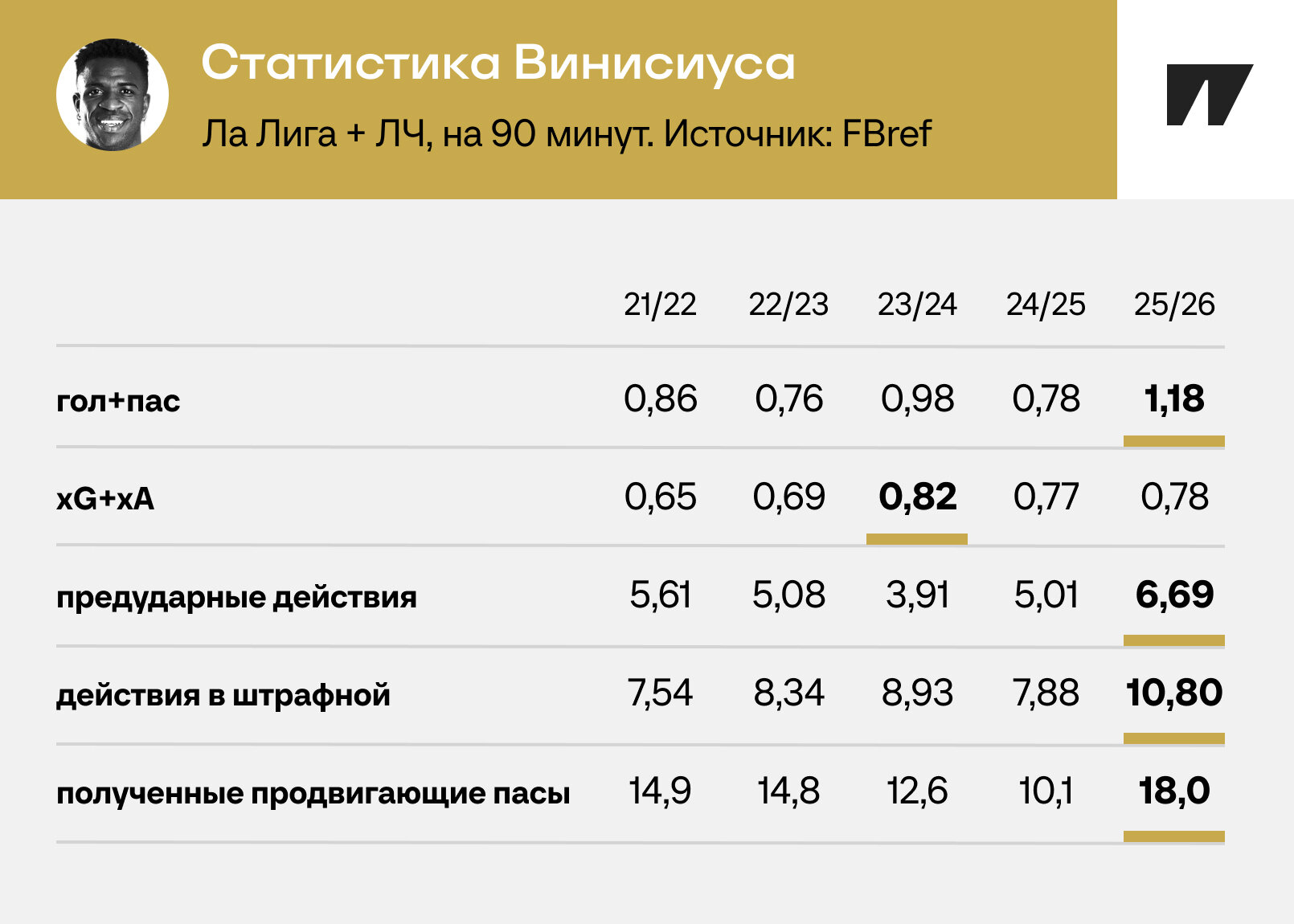 Винисиус бодро начал сезон у Хаби Алонсо: пять голов и четыре ассиста – лучший старт в карьере. На фоне прошлогоднего спада это глоток свежего воздуха: бразилец снова забивает и влияет на игру. Но даже при таком старте ощущается, что он все еще в поиске.