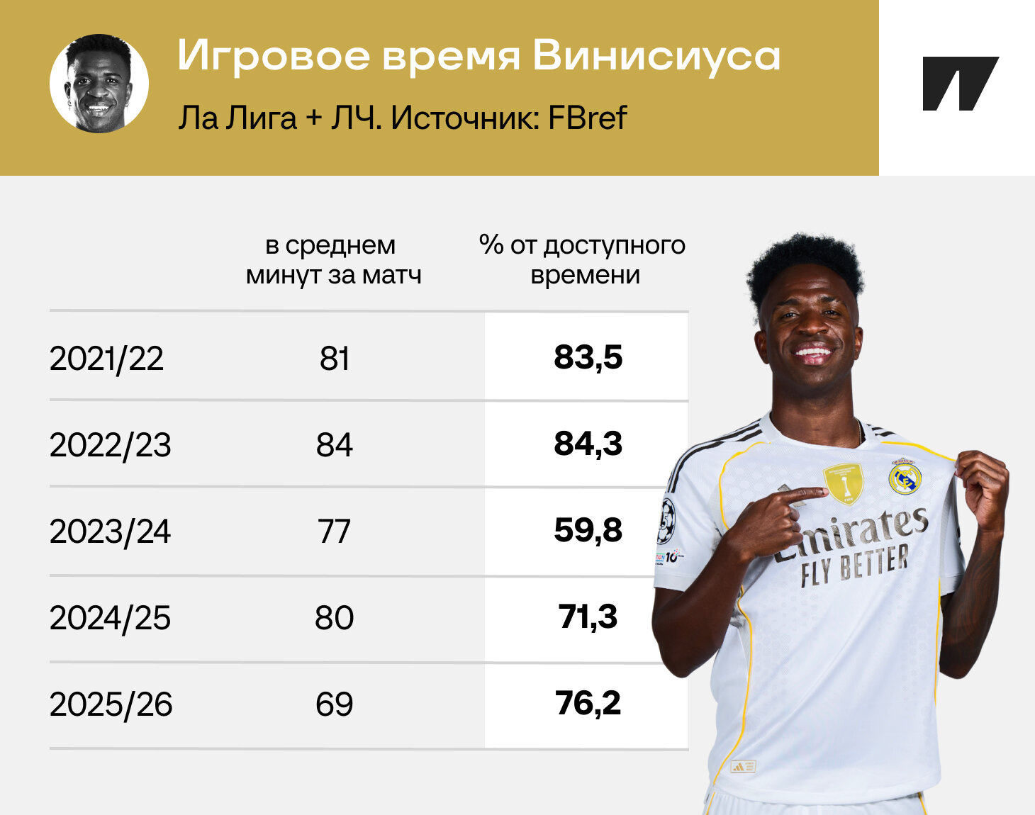 При этом пропорция от общего времени у Винисиуса даже лучше, чем в прошлые сезоны – пока не вылетал из-за травм.