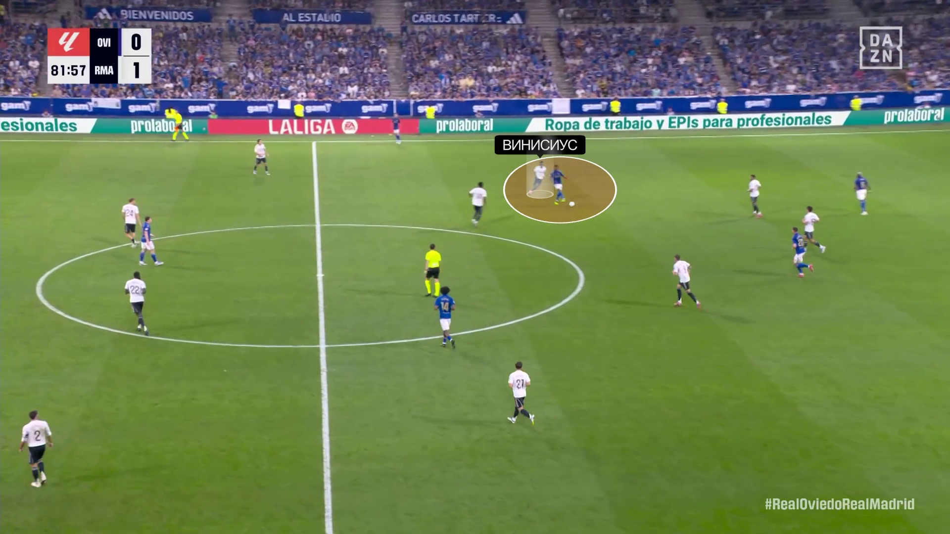 Винисиус охотно принял требования по игре без мяча и стал частым соучастником таких голов. Мяч Мбаппе в ворота «Овьедо» – отличный пример. Ситуация для отбора создала коллективная работа, но в решающий момент именно Вини прекрасно прочитал момент и отобрал.