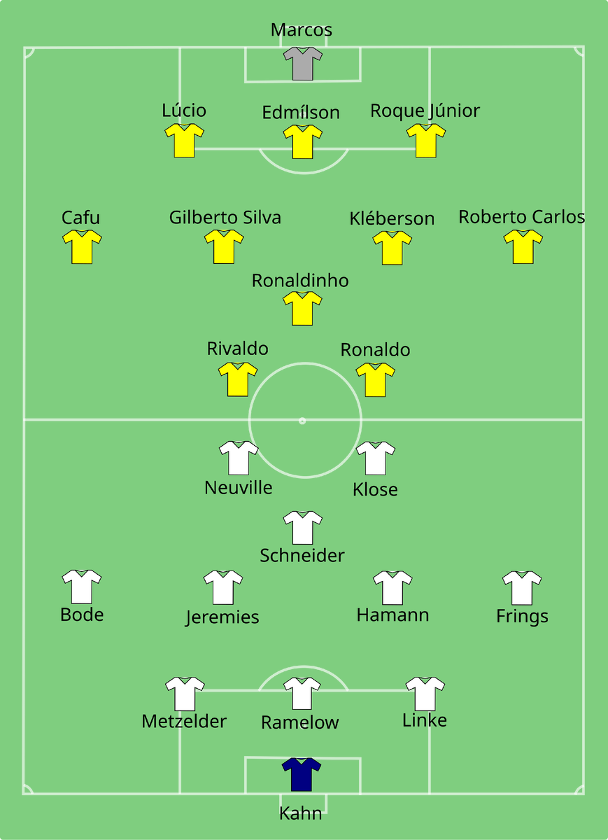 Это начали, повторюсь, ещё Ривалдо и Роналдиньо, когда в турнире 2002 в некоторых матчах Ривалдо и Роналдиньо выходили не на флангах в четверке с 2 напами (Роналдо и Бебето!), а в тройке с одним Роналдо! При том в гораздо более высокой позиции, чем при Загалло. Сколари (см. иллюстрацию выше, от 2002 года) не просто ставил их выше в полуфланги, но нередко разрешал и поощрял для Ривалдо и Роналдиньо смену позиций… Ривалдо часто оказывался периодически в правой инвертированной позиции, как потом Месси, а Роналдиньо двигался по всему фронту атаки, как настоящий плеймейкер, и вел игру сборной на любом участке поля. И в центре и на правом фланге в том числе… А не только слева, откуда он формально стартовал!