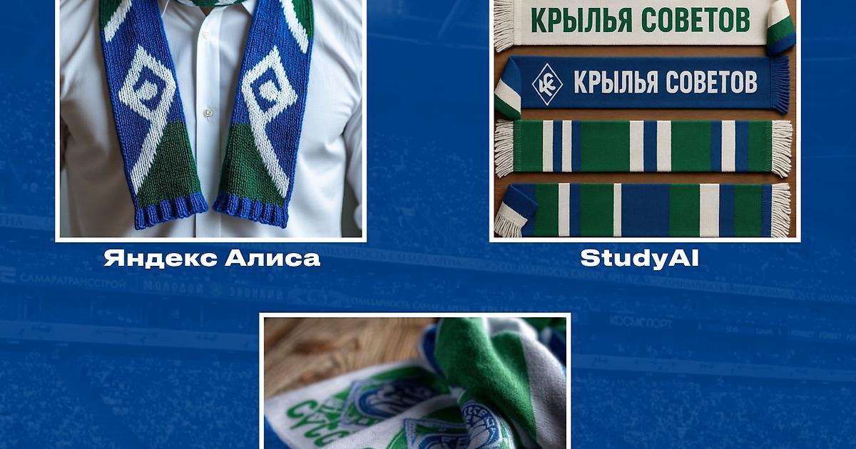 Новая рубрика, в которой мы при помощи популярных нейросетей изучаем/разбираем какие-либо темы о «Крыльях». Например, сейчас мы у трёх нейросетей (Яндекс Алиса, Midjourney и Study AI) попросили визуализировать идеальный шарф для самарской команды в зелено-бело-синих цветах.