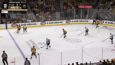А теперь смотрите: это первый матч сезона, против «Лос-Анджелеса». «Вегас» горел в две шайбы, но отличный подарок сделали Алекс Туркотт (5 минут штрафа) и Алекс Лаферрьер (оставил команду в двойном меньшинстве на 73 секунды). Так «Найтс» отыграли одну шайбу: