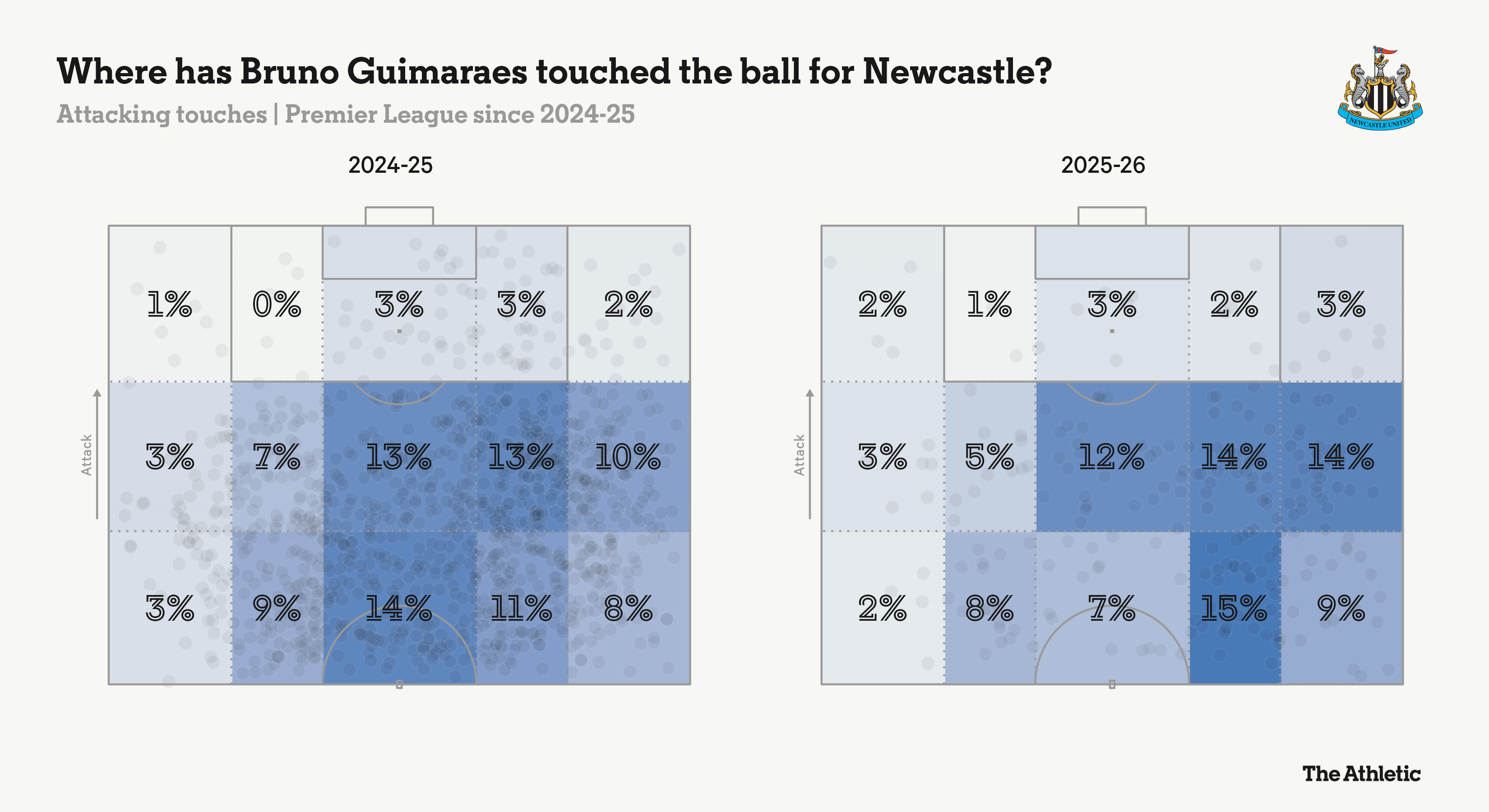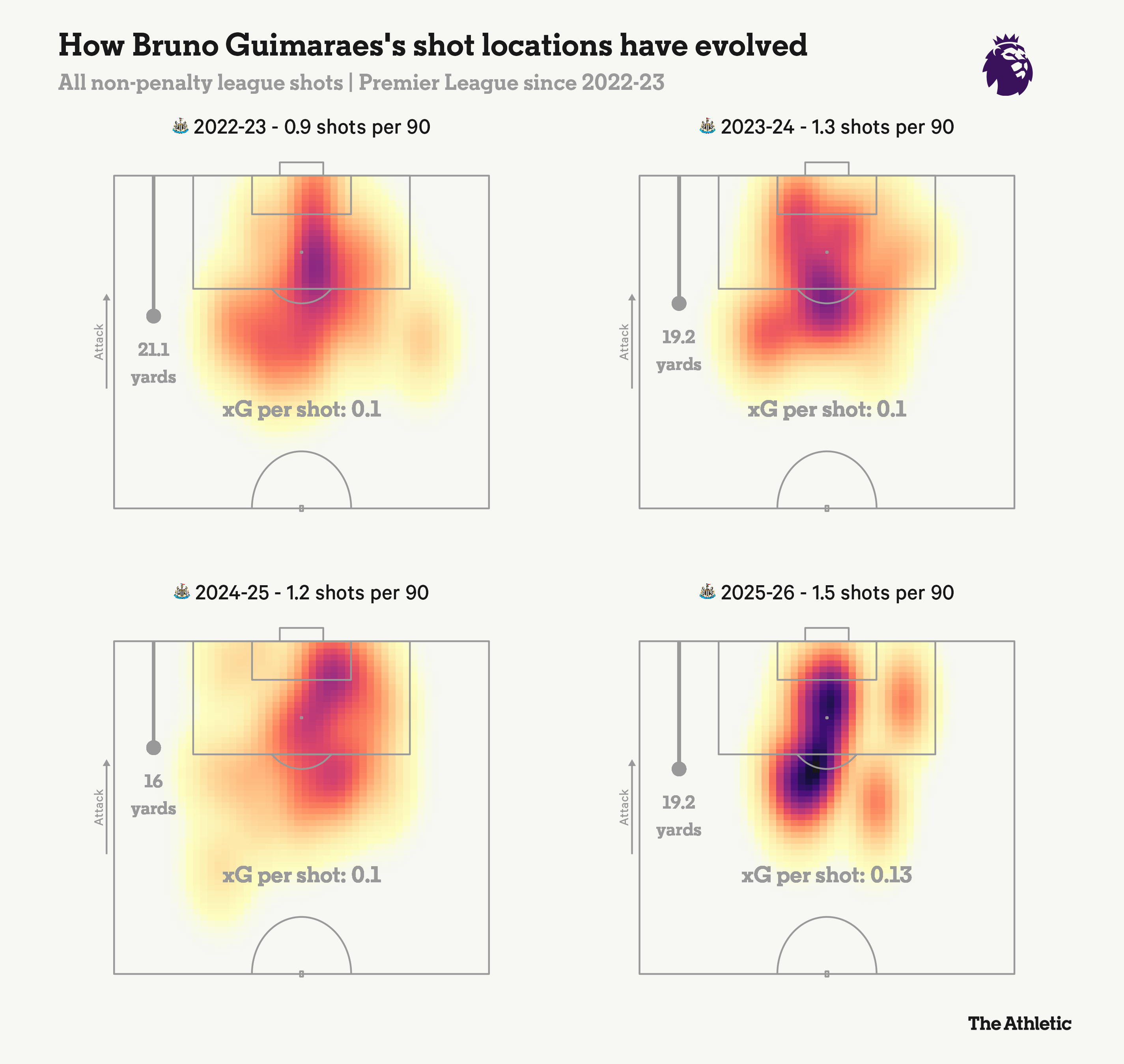Эдди Хау активно поощряет Гимараэса чаще входить в штрафную, используя специальные упражнения для бразильца. Хау требует от своего капитана больше ударов (и голов). Примечательно, что зона ответственности Гимараэса практически не меняется от сезона к сезону, как показано на фото ниже.