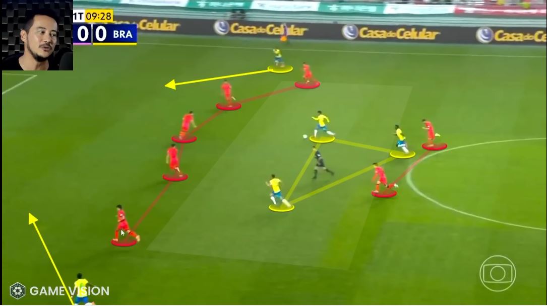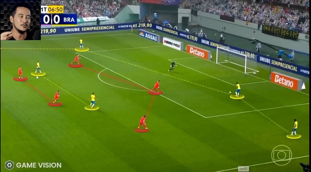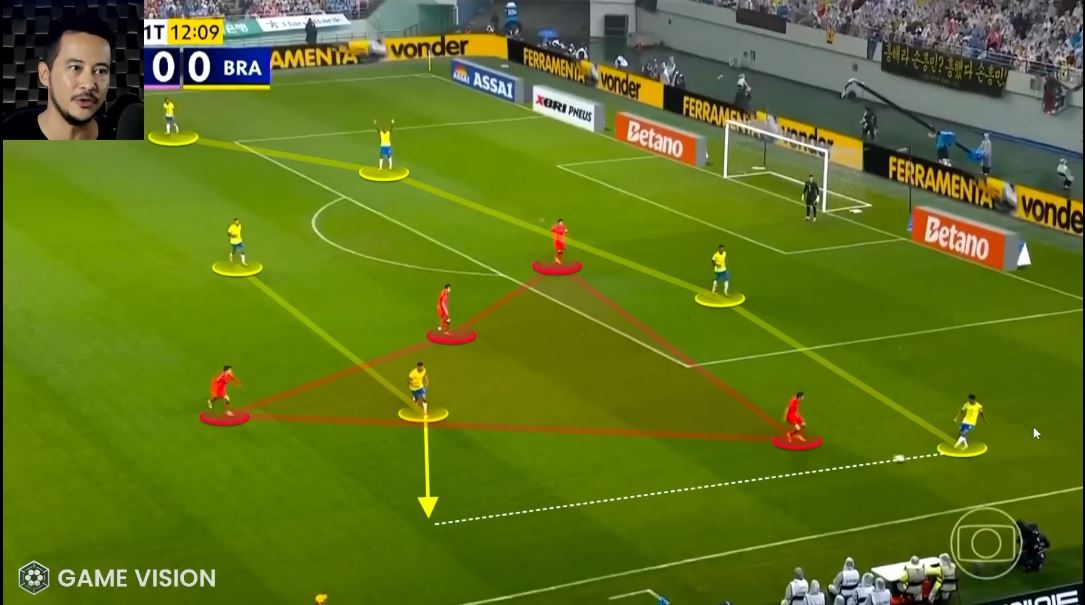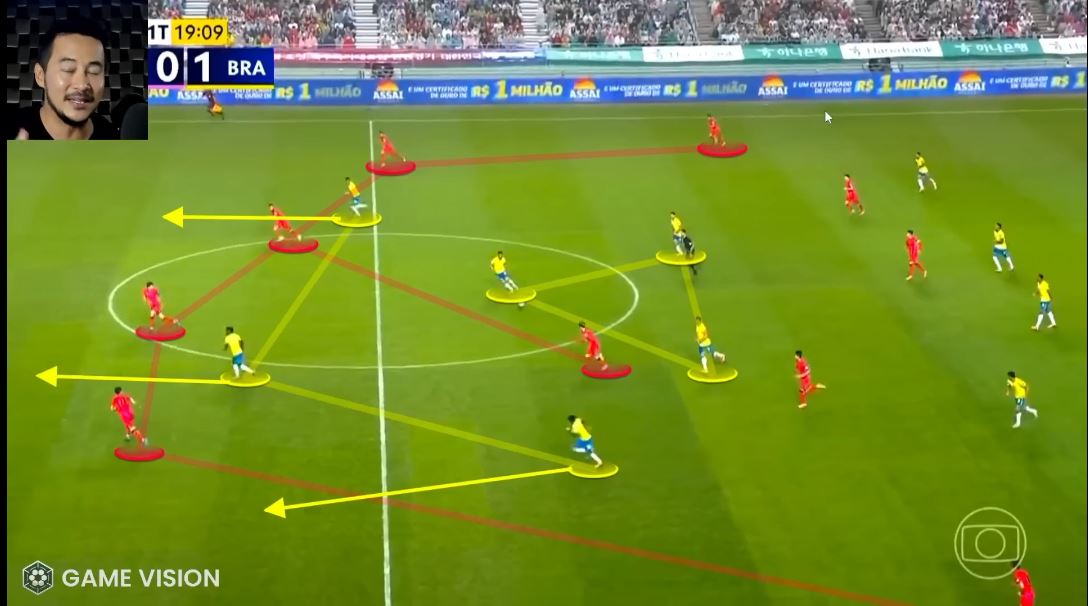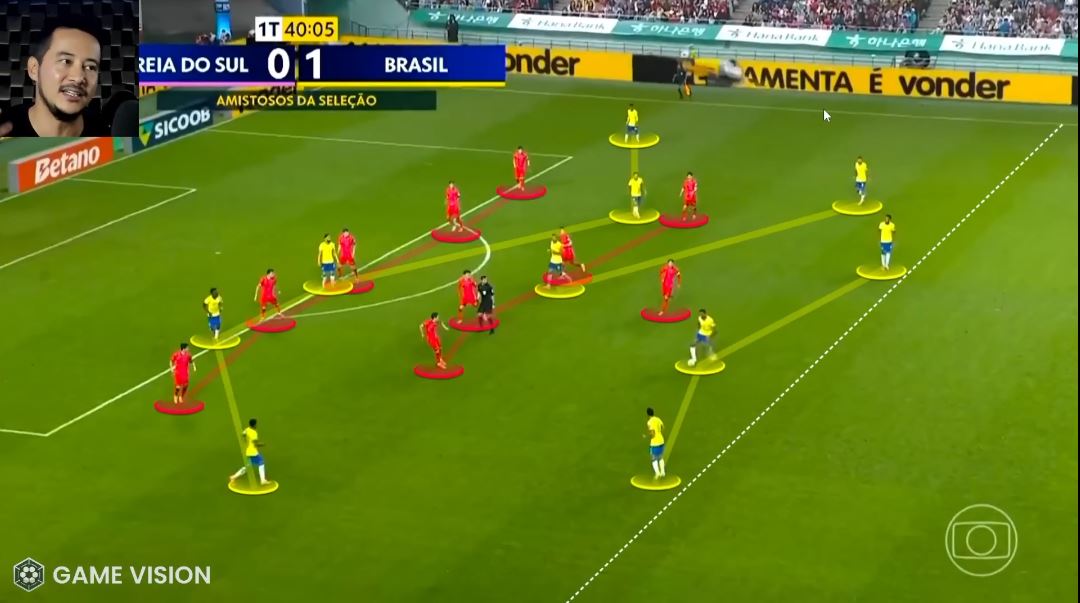 Не было всех этих триангулос (треугольников) на флангах, позволявших сопернику вовремя сгруппироваться и перекрывать зоны. И отмечу иное по качеству движение всей линии атаки. Оно не было хаотичным, но при этом поощрялась любая форма свободы. Винисиус или Эстевао не утыкались в фланг и со взглядом в пол не перепахивали его как ЧТЗ, а искали наиболее слабые точки в корейской обороне и давили на них.