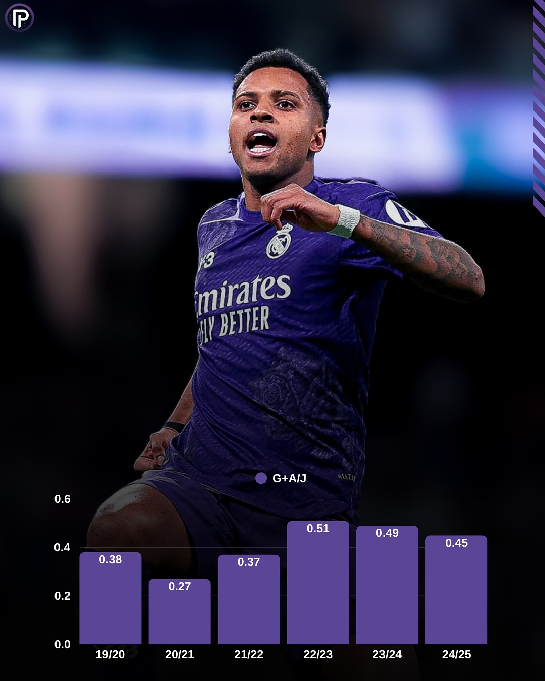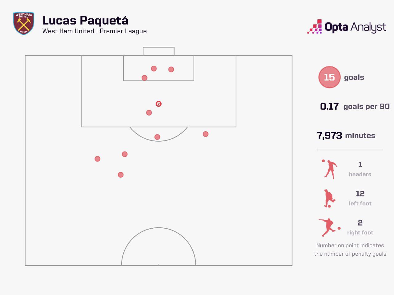 Это значительный прогресс по сравнению с девятью голами в его предыдущих 57 матчах высшего дивизиона, в среднем один гол на каждые 6 игр. При соотношении минут на гол за три года в 521,9, за последние шесть месяцев Гимараэс забивает каждые 175,2 минут. За 90 минут он стал чаще бить по воротам (1,9 против 1,3), чаще бить в створ (0,8 против 0,4), чаще касаться мяча в штрафной площади соперника (3,7 против 2,2) и имеет значительно более высокий xG ( 0,23 против 0,15).