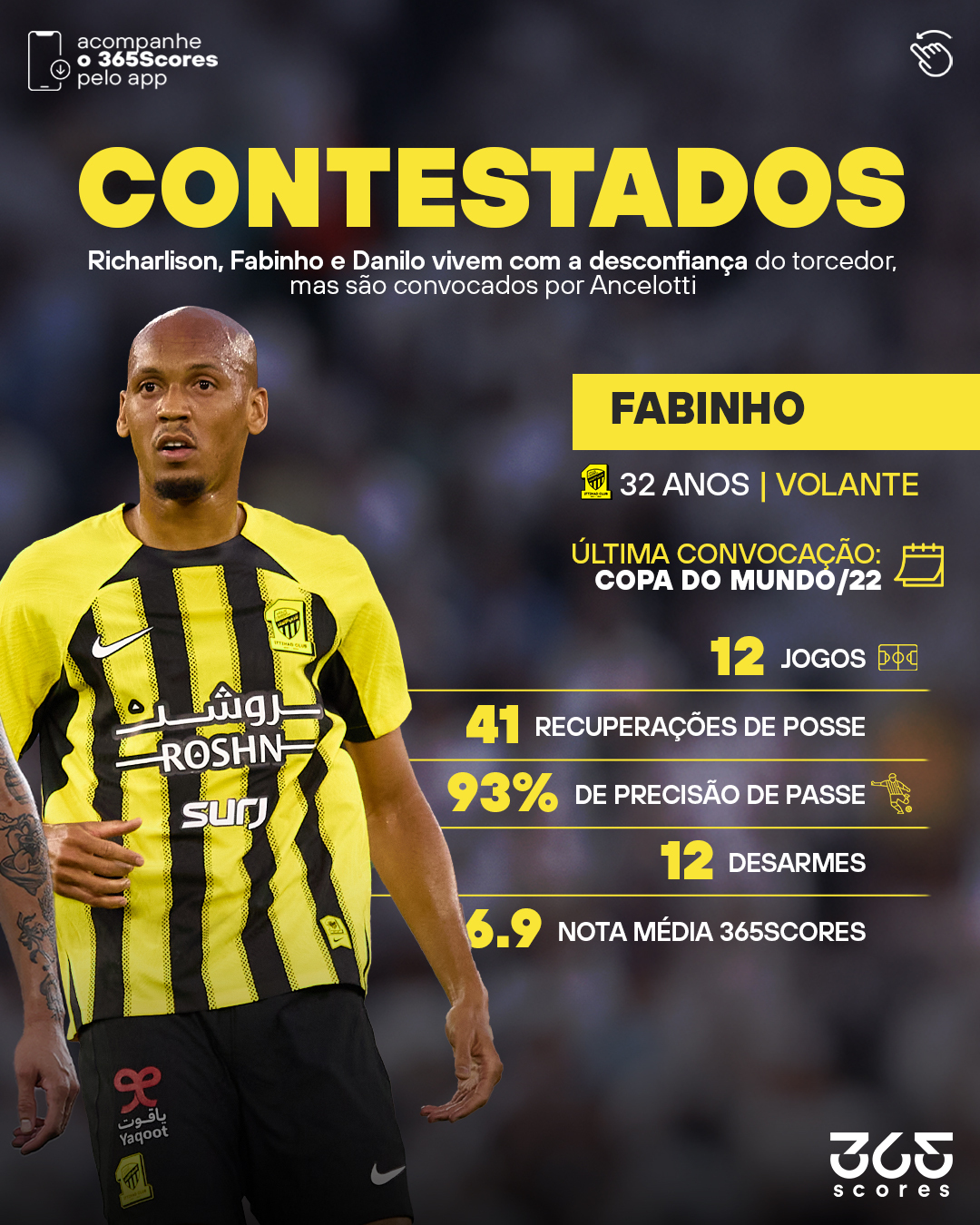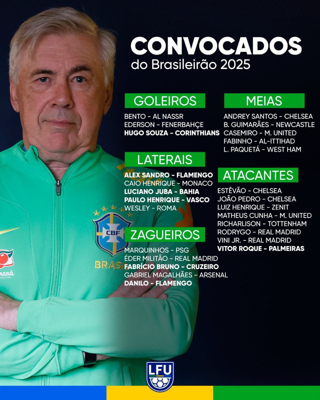 Насчёт Фабиньо это прям сюрприз в квадрате. Никто из бразильских журналистов и инсайдеров даже не думал и не намекал в его сторону, в расширенном списке Анчелотти его тоже не было. Говорят что итальянец принял решение о вызове после приватной беседы с Каземиро, и тот посоветовал старого товарища как игрока с максимально близкими к его характеристиками. Честно я ничего не могу сказать о текущей форме Фаби, может кто видел его в саудовской лиге? Для меня он как тихо и без амбиций отчалил после Катара в персидский закат, так и перестал притягивать хоть какое-то внимание.