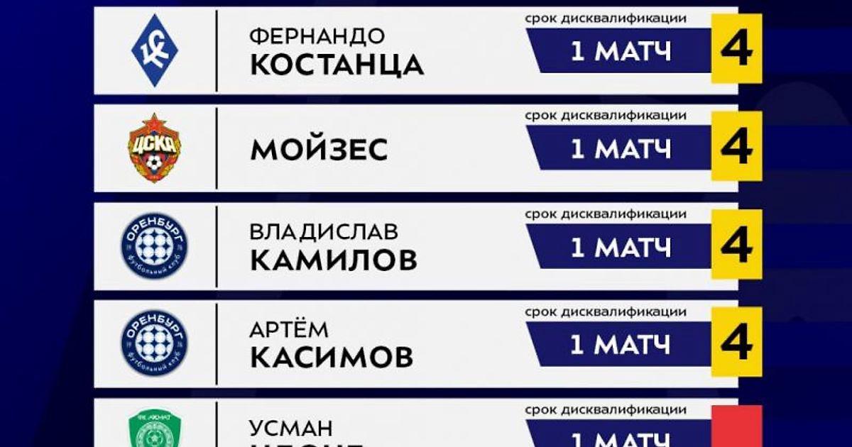 Московское дерби между ЦСКА и «Локомотивом» пропустит защитник армейцев Мойзес, получивший 4 желтые карточки в предыдущих матчах. Сразу четыре футболиста не смогут сыграть в матче между «Крыльями Советов» и «Оренбургом», это Николай Рассказов и Фернандо Костанца из самарской команды, а также Владислав Камилов и Артем Касимов из оренбургской. Все они так же ранее получили свои четвертые желтые карточки. Усман Ндонг не сможет помочь «Ахмату» в гостевой встрече с «Динамо». В предыдущей игре он получил красную карточку.
