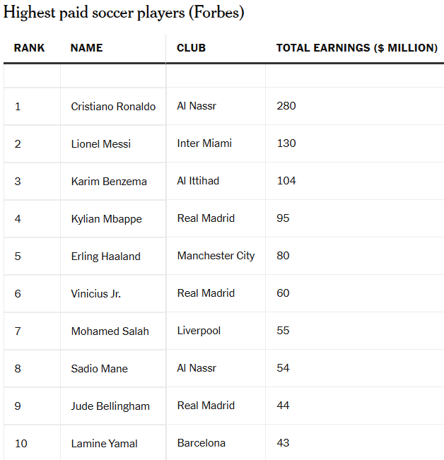 По общему годовому доходу первое место занял форвард «Аль-Насра» Криштиану Роналду – 280 млн долларов (230+50). Далее идут нападающий «Интер Майами» Лионель Месси – 130 млн (60+70) и «Аль-Иттихада» Карим Бензема (100+4).