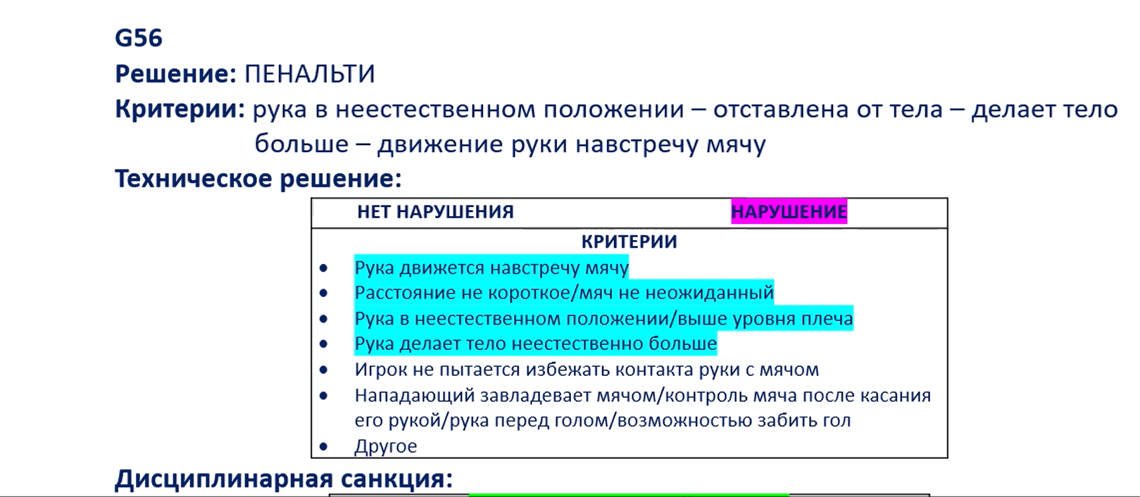 Как видим: то что в эпизоде с Круговым названо «естественным положением руки» в этих эпизодах таковым не является и вердикт однозначен - нарушение правил. Конечно, кто - то начнёт спорить об устаревших трактовках, и тогда нам стоит заглянуть в методичку за нынешний год . Где представлен вот такой эпизод.