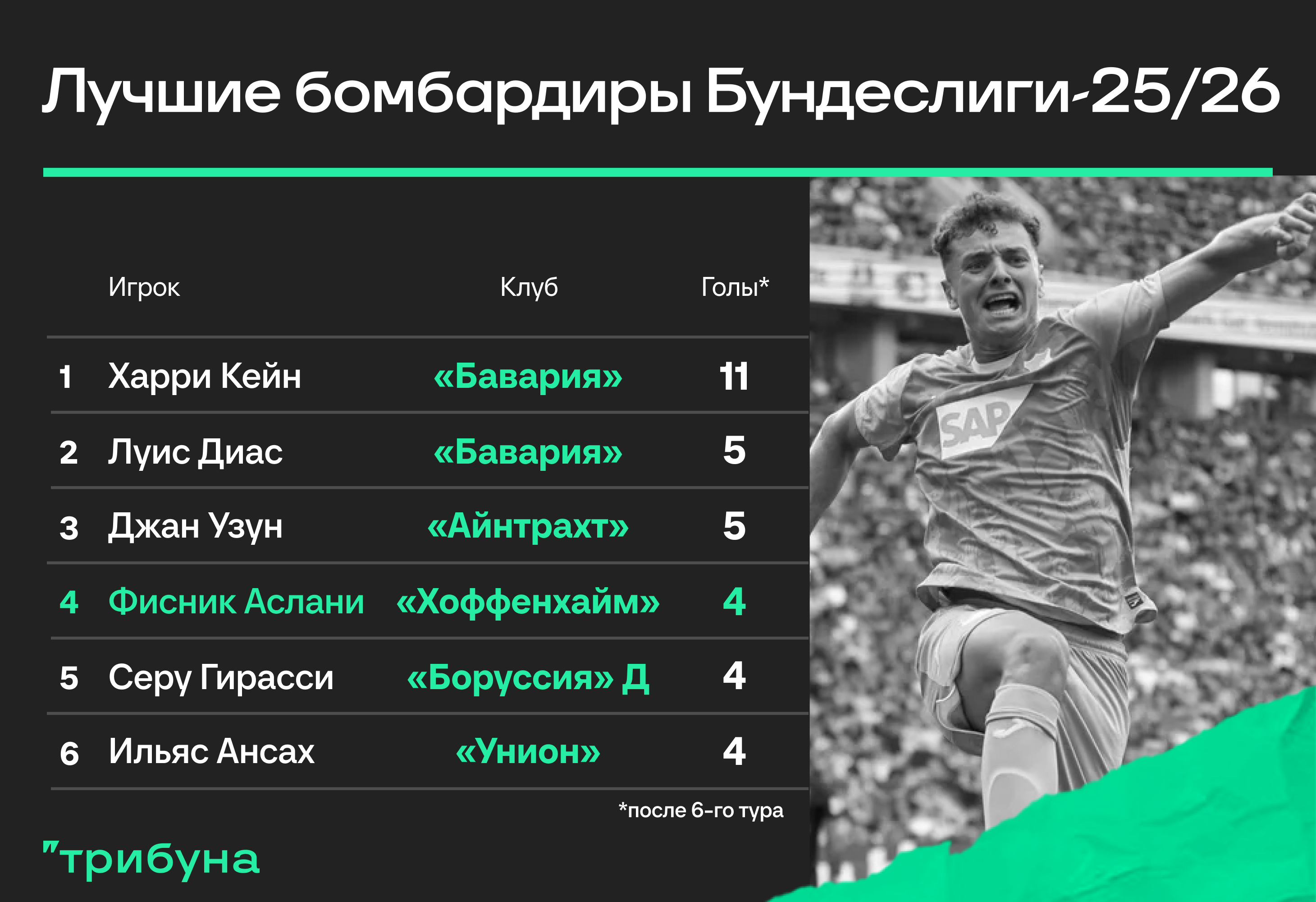 В следующих трех турах Аслани немножко сбавил голевой темп: забил только «Фрайбургу», пожалел «Баварию» и «Кельн». Прямо сейчас Фисник – четвертый бомбардир Бундеслиги.