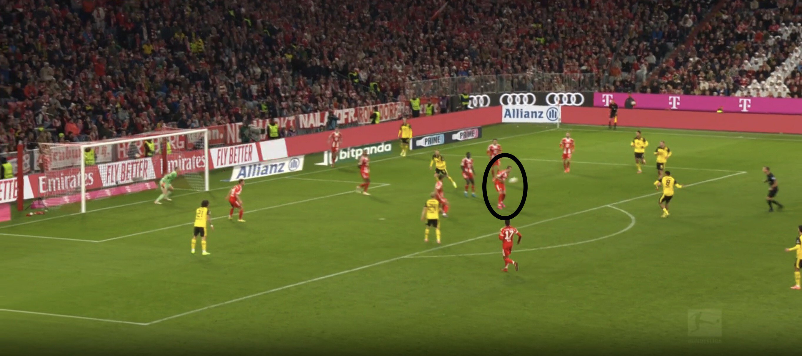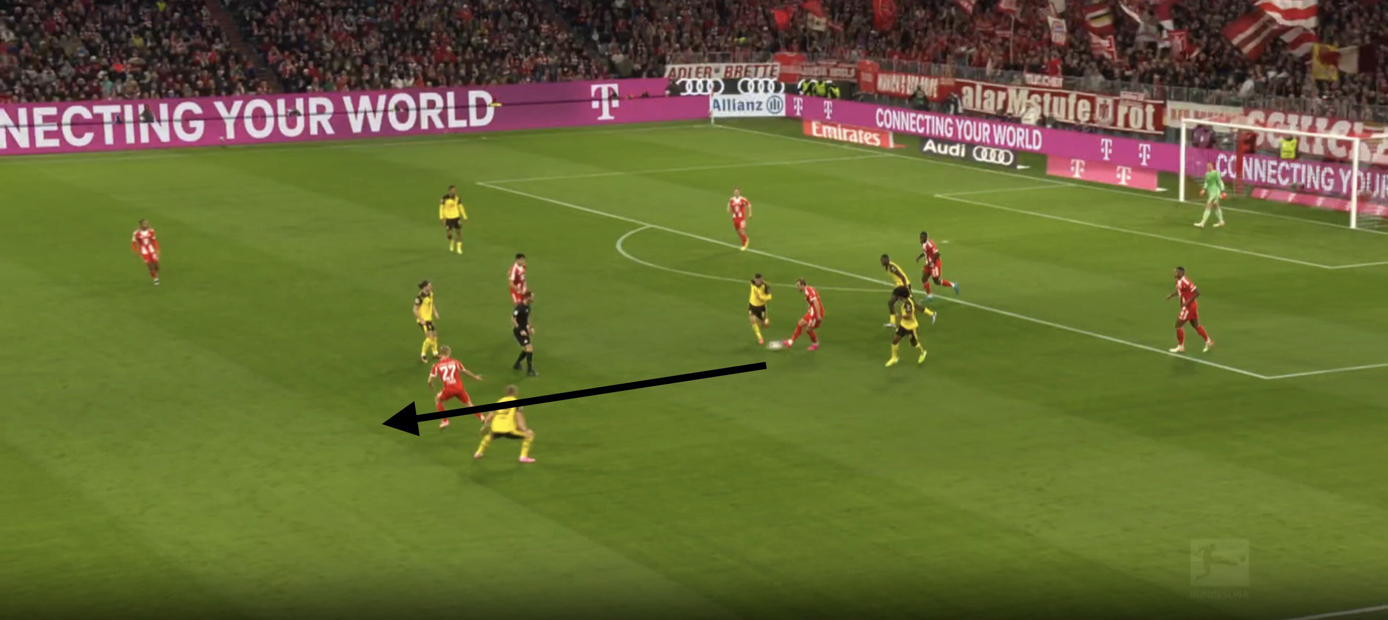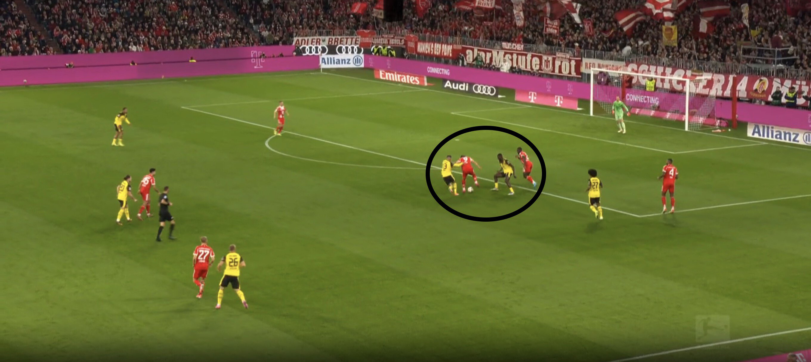 Пожалуй, редкое слабое место «Баварии» на дистанции выдающегося старта сезона: опорники в позиционной защите то теряют опорную зону, зону подбора, то не успевают за включениями полузащитников соперника на острие. «Дортмунд» воспользовался этим.