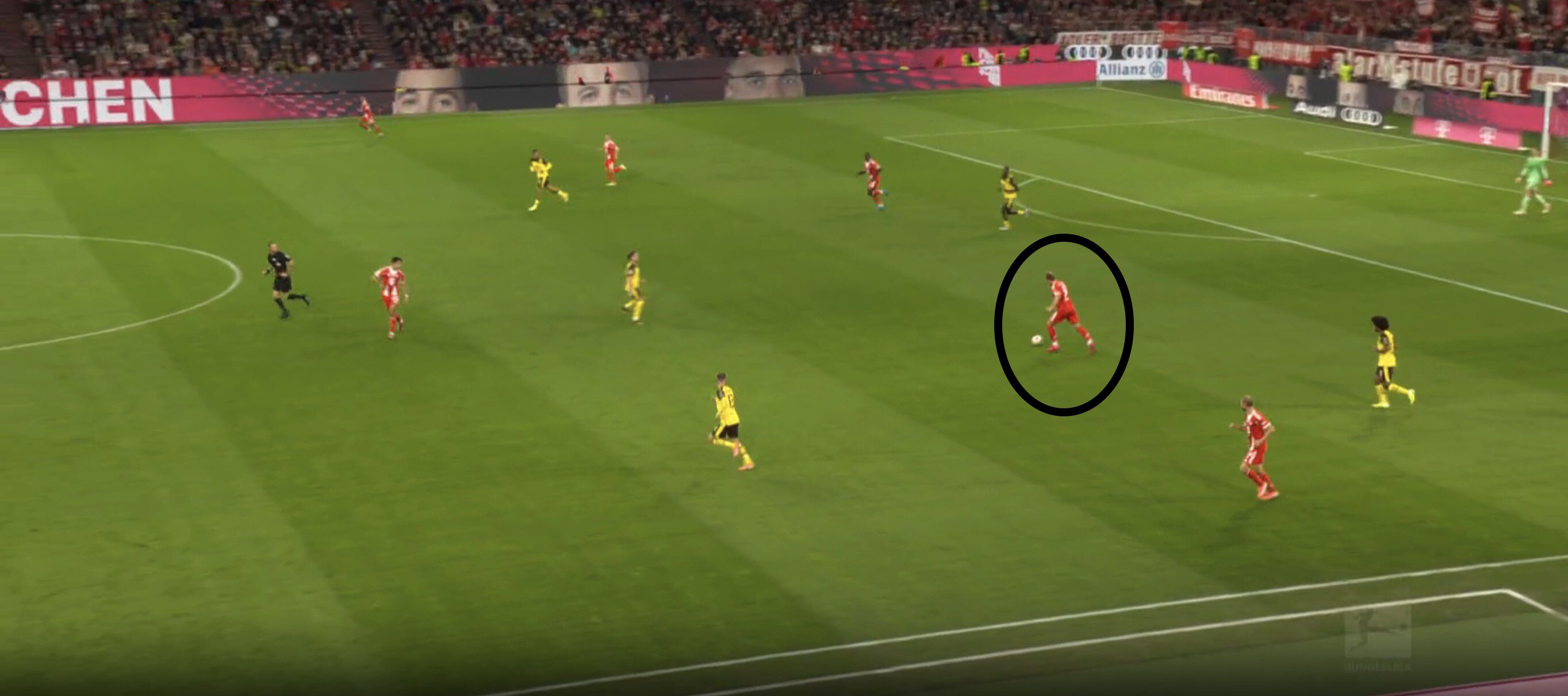 Мюнхенцы спокойно контролировали мяч и очень легко вскрывали «Дортмунд» при робких попытках прессинговать, Кейн – ключевая фигура. В развитии атаки он очень здорово находил Конрада Лаймера, который затем тащил мяч по полуфланговому коридору. Этот навык Лаймера делает его очень полезным для сегодняшней «Баварии».