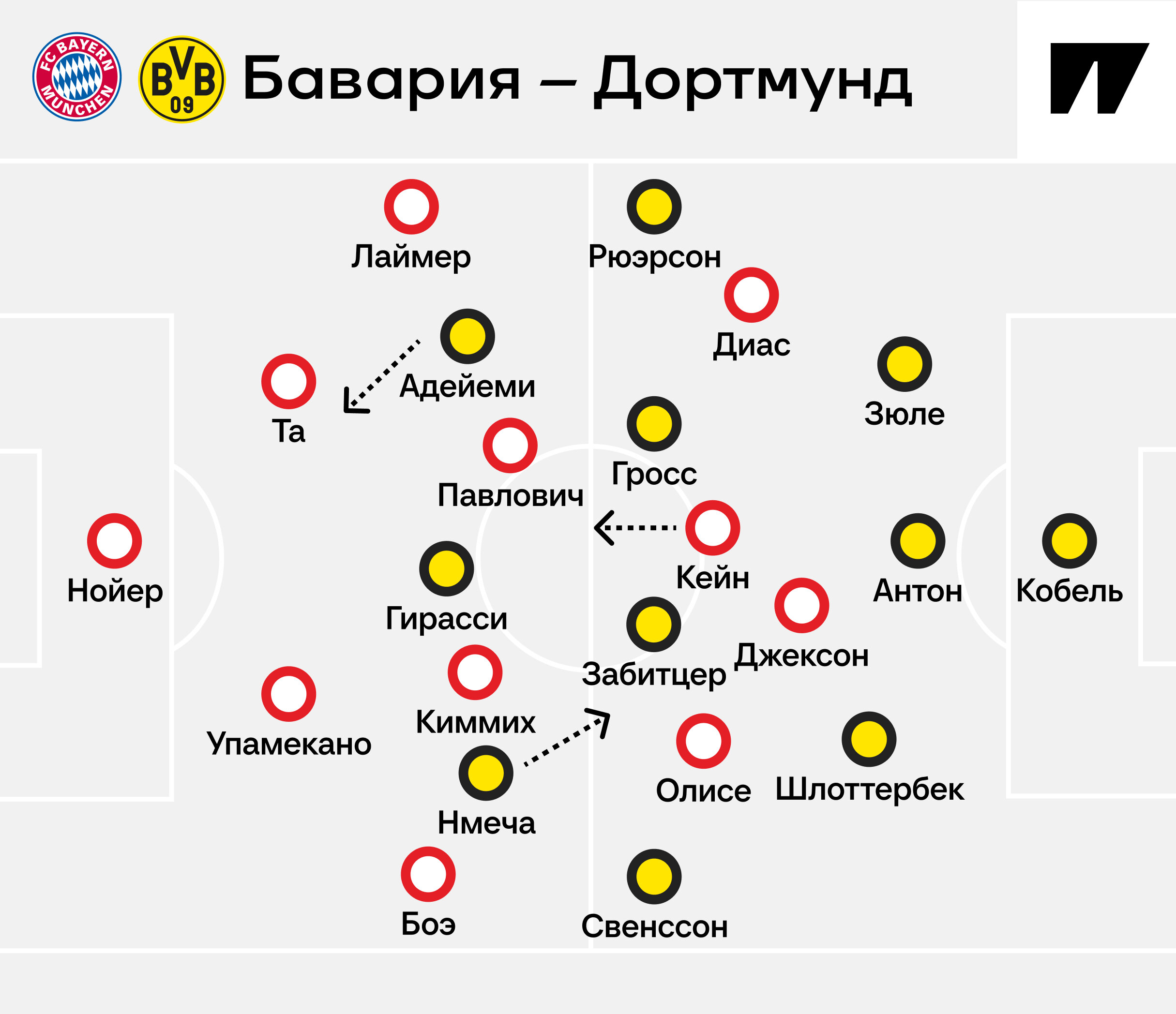 «Дортмунд» подготовил пару сюрпризов. Первый – выход Никласа Зюле, а не Рами Бенсебайни, одного из лучших игроков «Боруссии» на старте сезона (был не готов на 100% после матчей сборных). Второй – необычная гибридная позиция Феликса Нмечи, который был то третьим полузащитником, то третьим нападающим. Обычно Нмеча действует в паре с Марселем Забитцером, здесь рядом с австрийцем появился Паскаль Гросс. Оборонительный выбор Нико Ковача.