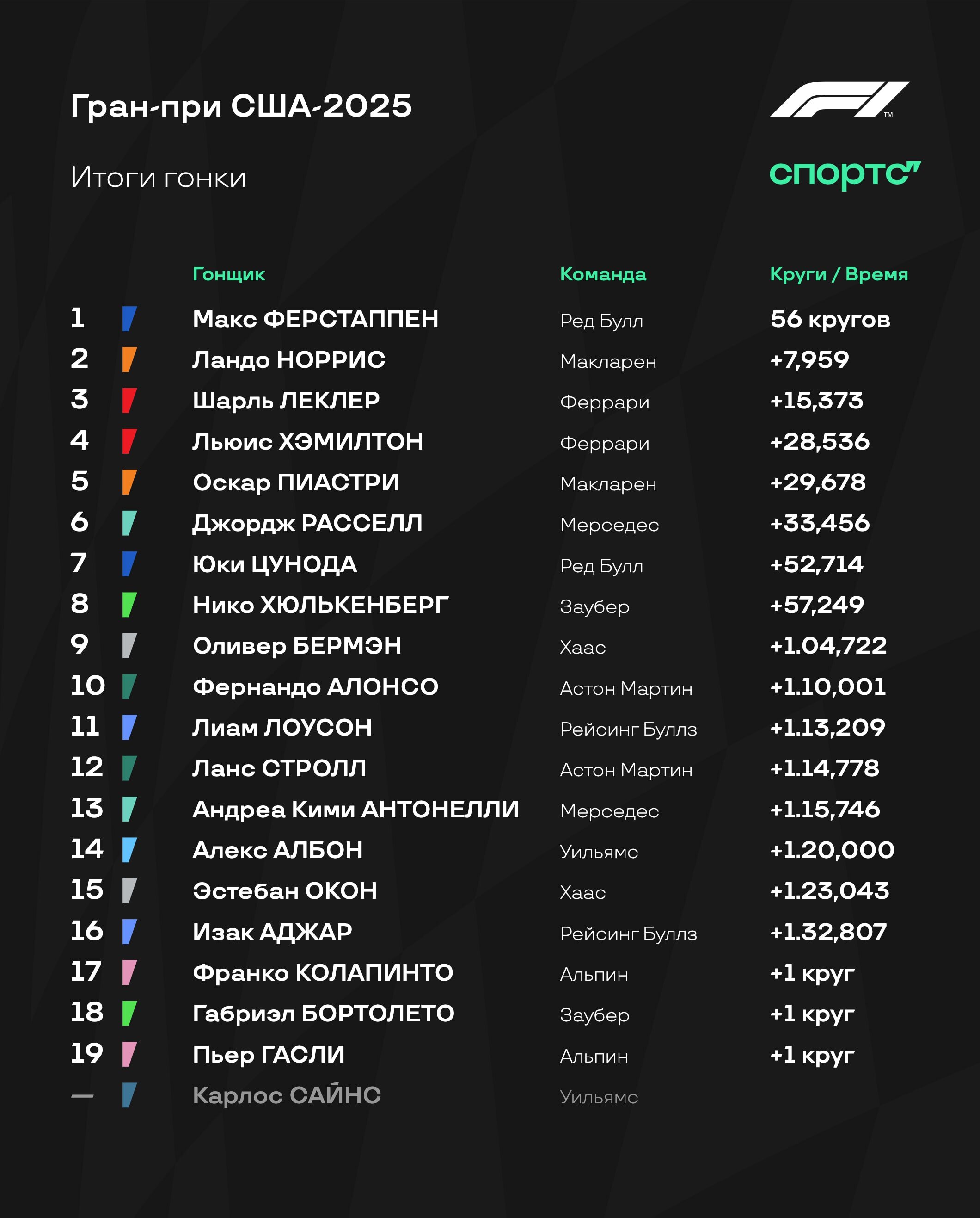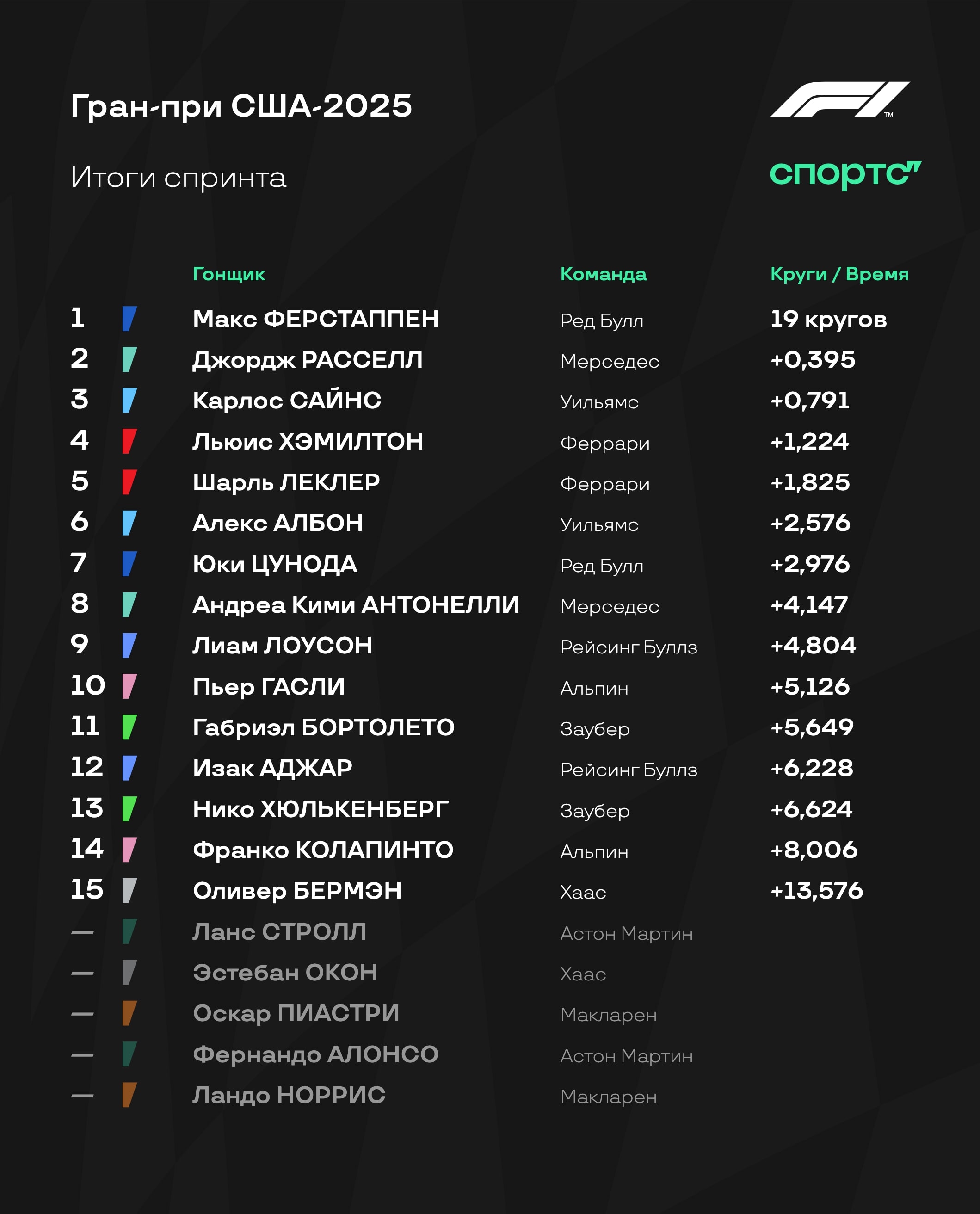 Благодаря схватке «Феррари» и «Макларена» Ферстаппен спокойно доехал до финиша первым – и оформил все победы на Гран-при: спринтопоул, спринт, поул и гонка! Норрис и Леклер закрыли подиум, а за ними драма – Хэмилтон с проколом едва успел проскочить перед Пиастри.