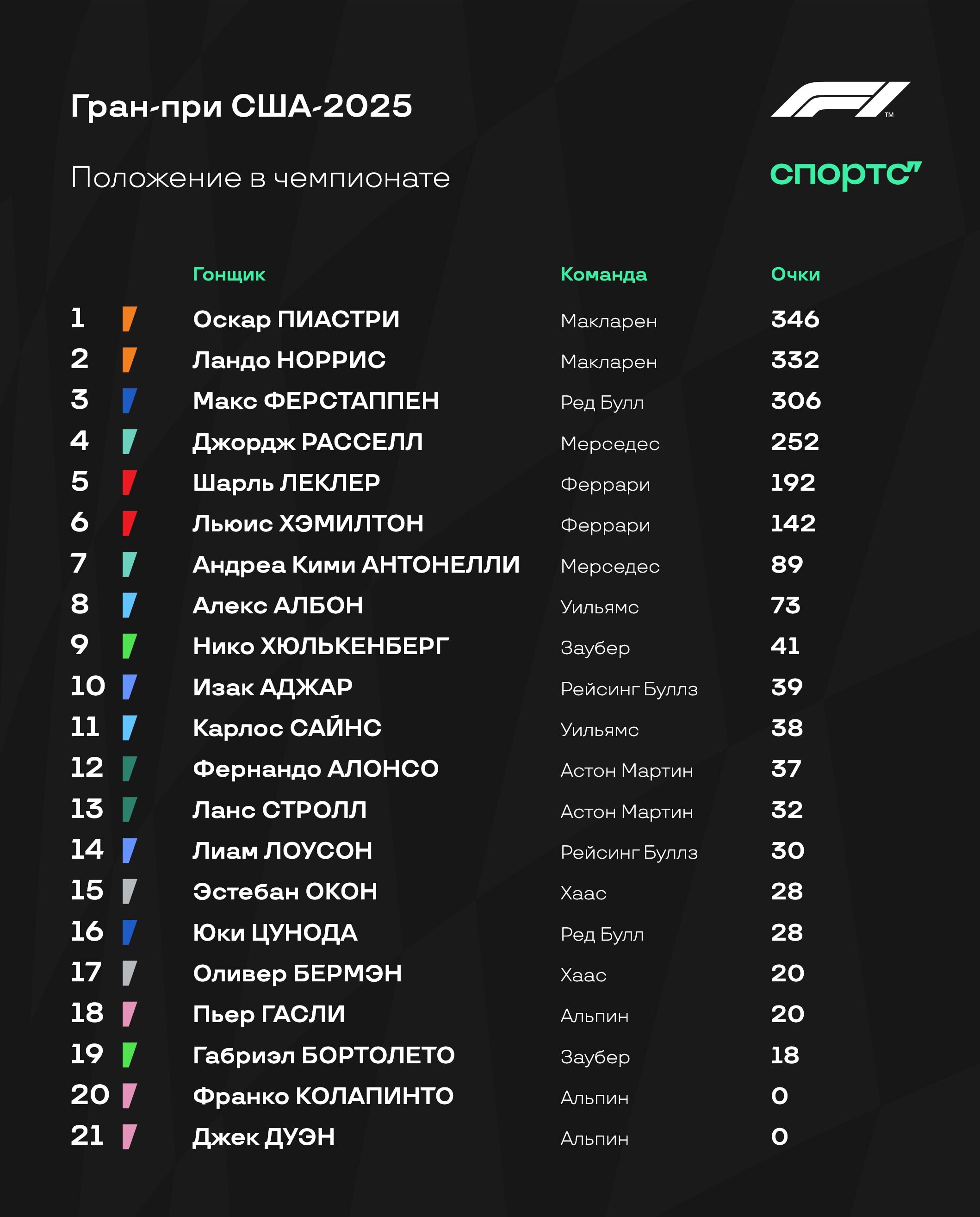 Теперь Ферстаппен уже точно-точно в чемпионской схватке. Отыграно безумное количество очков – теперь до Пиастри всего 40 баллов! Всего сокращено 57 очков за 5 Гран-при.