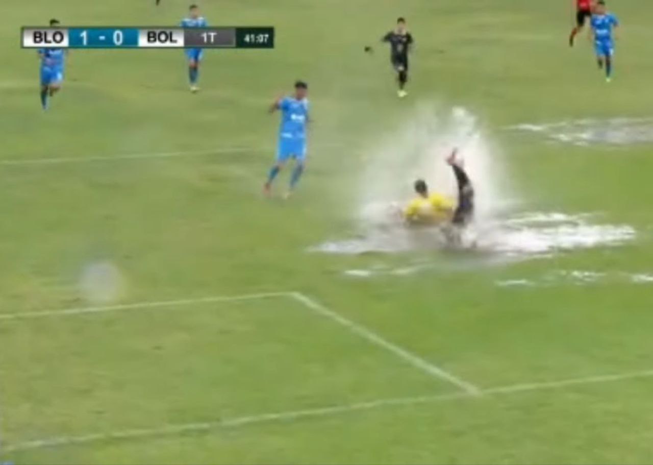 В итоге счет открыл «Блуминг», на 33-й отличился Сантьяго Этчебарне. А через шесть минут – самый трэшовый эпизод матча. «Боливар» побежал отыгрываться, но бедного Баталлини снова сбили в штрафной, на этот раз вратарь. Дамиан упал во всю ту же злосчастную лужу.