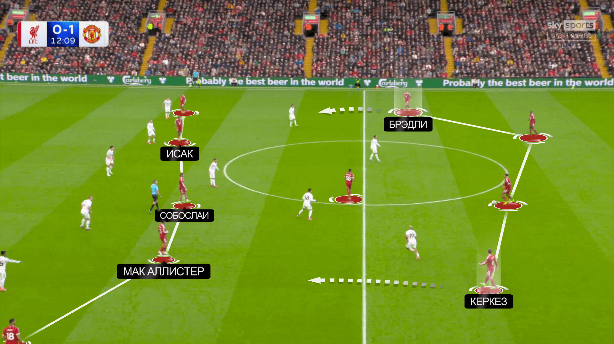 Самым частым вариантом от Слота была структура, в которой Салах и Гакпо держат ширину, а между линиями открываются Мак Аллистер, Собослаи и Исак. Причем именно в таком сочетании – с Исаком ближе к правому флангу. Крайние защитники Керкез и Брэдли в выжидательной позиции и тоже готовы подключаться, если обнаружат свободную зону.