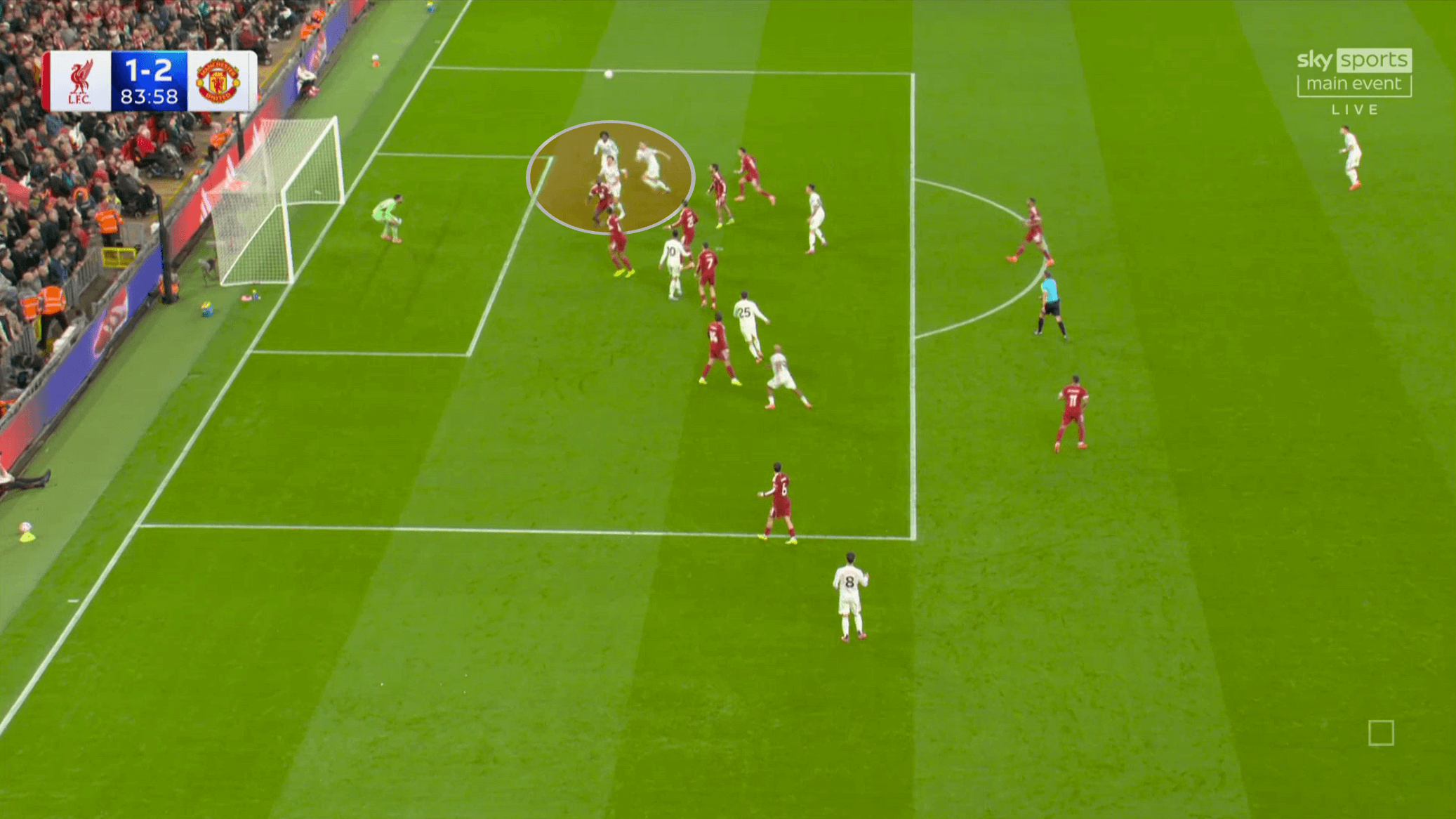 Интересная особенность «МЮ» в таких моментах – игроки не открывались под скидку в случае возможной выигранной верховой, а сразу насыщали зону подбора. Будто бы дуэль за верховой мяч – лишь отвлекающий маневр. А настоящая задача – выиграть подбор и быстро атаковать после него: