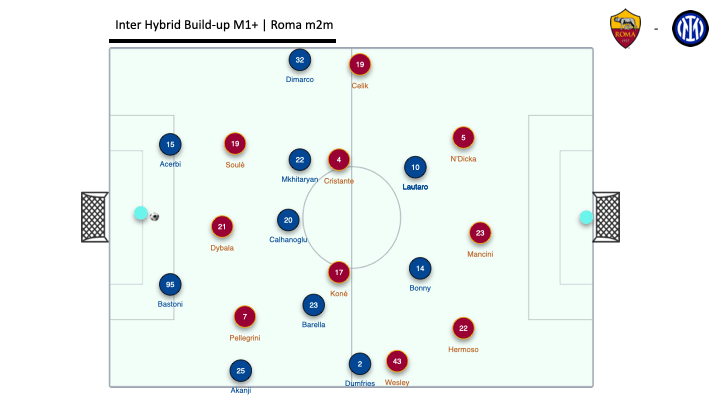 Пара Чалханоглу – Барелла устроила перфоманс под названием «максимальный ренессанс свободы». Хакан часто опускался к линии защитников, как второй ЦЗ, а Барелла занимал все поле — от глубины до правого полуфланга. Именно оттуда и родился ключевой эпизод, когда «Интер» вскрыл брюхо «Ромы» одним длинным пасом за спину не то что всей линии обороны, а вообще всей «Ромы».