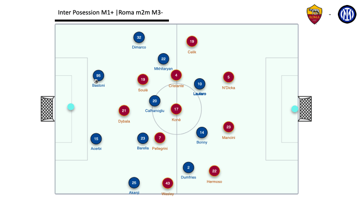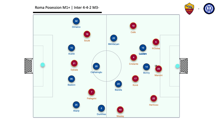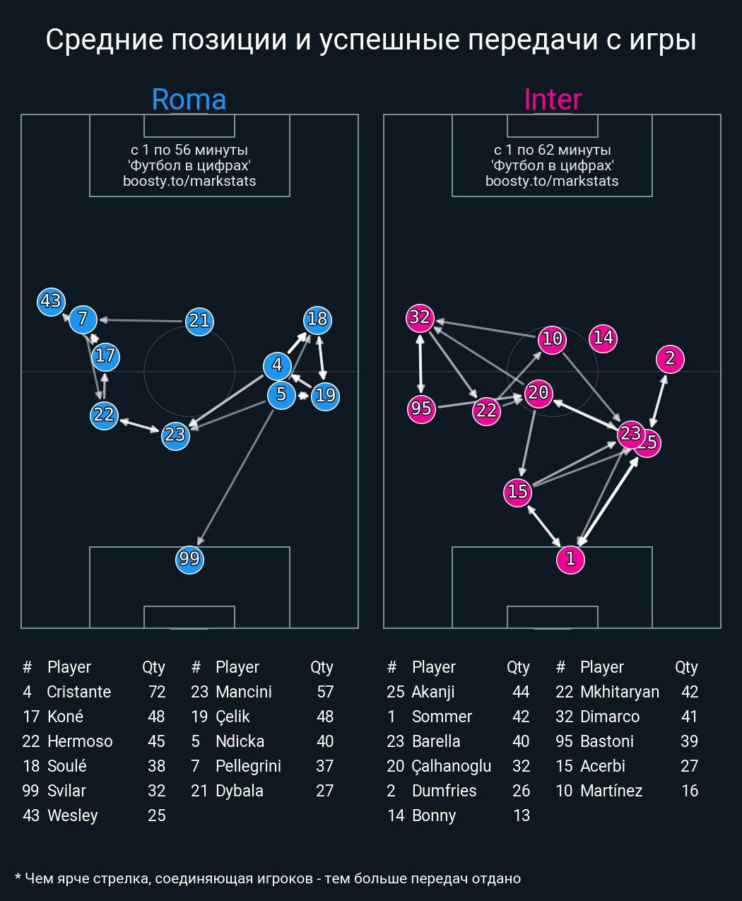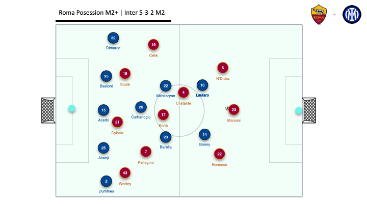 Ближе к середине первого тайма «Рома» пришла в себя и перестроилась: Кристанте и Коне стали чаще опускаться ниже, помогая в билд-апе и растягивая соперника по флангам. Схема трансформировалась в (3+2)-4-1, где опорники фактически создавали ширину. На карте передач видно, как сильно «Рома» фокусировалась на флангах, а их сеть пасов словно обволакивает блок «Интера» — широкая, уверенная, но без реальной глубины.