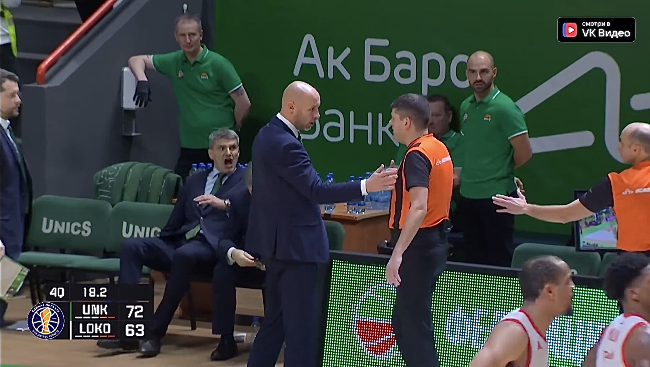 Однако с тем падением Миллера как будто началось и падение команды Антона Юдина в этой игре. И вот уже УНИКС выдает отрезок с этим же магическим «11:0». Счет становится 64:57 в пользу хозяев за 3:48 до конца, и главный тренер «Локо» берет тайм-аут.