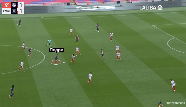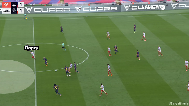 Все моменты «Жироны» шли по одному сценарию: потеря у игрока «Барсы» – две-три передачи – проникающий пас между линиями. Яркий пример – удар в штангу от вингера Порту, атака родилась после потери Педри.