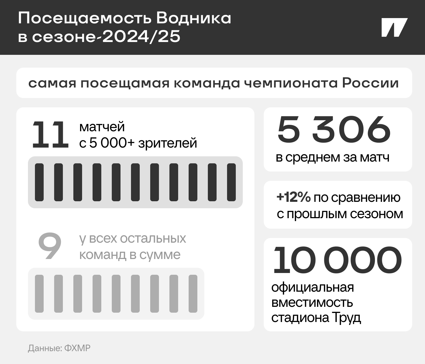 В среднем, в сезоне-2024/25 на хоккей в Архангельске ходили по 5 306 человек. Для сравнения: по данным на 2024 год, на «Северсталь» в КХЛ ходили по 4 495 человек, на нижегородское «Торпедо» – 5 500. Учитывайте, что домашний стадион «Водника» «Труд» открытый, а средние температуры в городе зимой -14 (бывает намного холоднее).