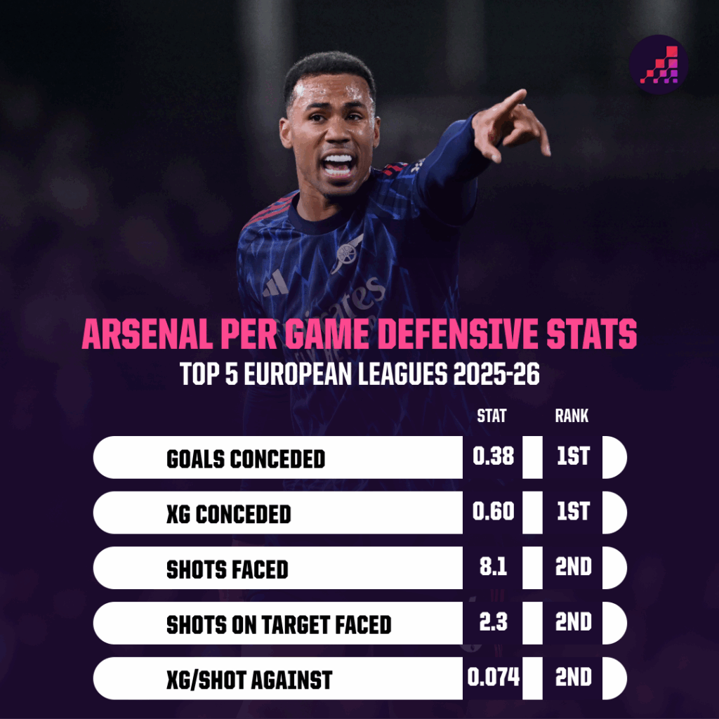 Микель Артета выстроил невероятно организованную оборону, и стартовые показатели лишь подчеркивают их доминирование. По среднему количеству пропущенных голов за матч «Арсенал» опережает все команды в топ-5 европейских лигах, как и по показателю Expected Goals Conceded (ожидаемые пропущенные голы). Они занимают второе место в Европе как по общему количеству ударов по их воротам, так и по количеству ударов в створ, в то время как качество пропускаемых ими моментов (измеряемое по xG за удар) также является вторым самым низким среди всех команд.