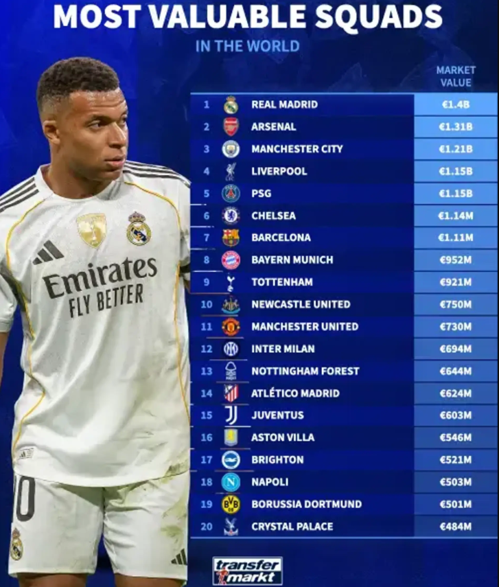 Премьер-лига остается главным финансовым гигантом футбола — совокупная стоимость клубов достигла €12,78 млрд. В топ-5 входят «Манчестер Сити», «Ливерпуль», «ПСЖ», «Челси» и «Барселона» — все с составами дороже €1 млрд.