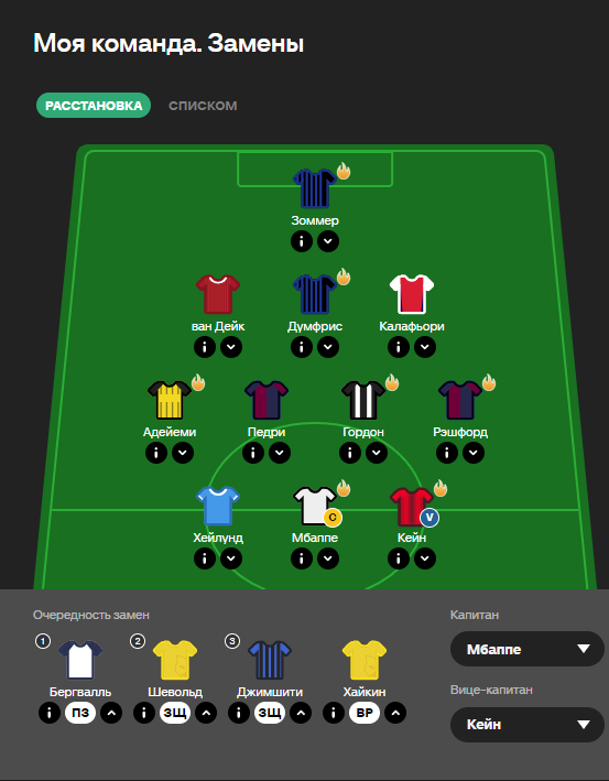 В средней линии Салах был заменен на полузащитника «сорок» Энтони Гордона – одного из лучших игроков по форме. «Ньюкасл» на своем поле принимает «Бенфику», поэтому ждем от Гордона дальнейших результативных действий. В нападении в качестве третьего форварда был приобретен голеадор «Баварии» - Харри Кейн, заменивший Феррана Торреса. Мюнхенцы принимают на своем поле «Брюгге», поэтому от Кейна ждем новых голов. В итоге впереди образовалось атакующее трио - Мбаппе, Хейлунд, Кейн на которое рассчитывает моя команда в третьем туре ЛЧ-фэнтези.
