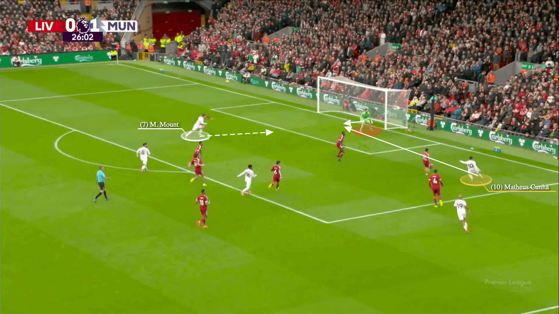 В атаке, приведшей к тому угловому, Шешко быстро сыграл в стенку с Фернандешем за спинами полузащитников «Ливерпуля», после чего Кунья рывком атаковал пространство за Конате и Собослаи, которые оба были сосредоточены на центральном нападающем «Юнайтед».