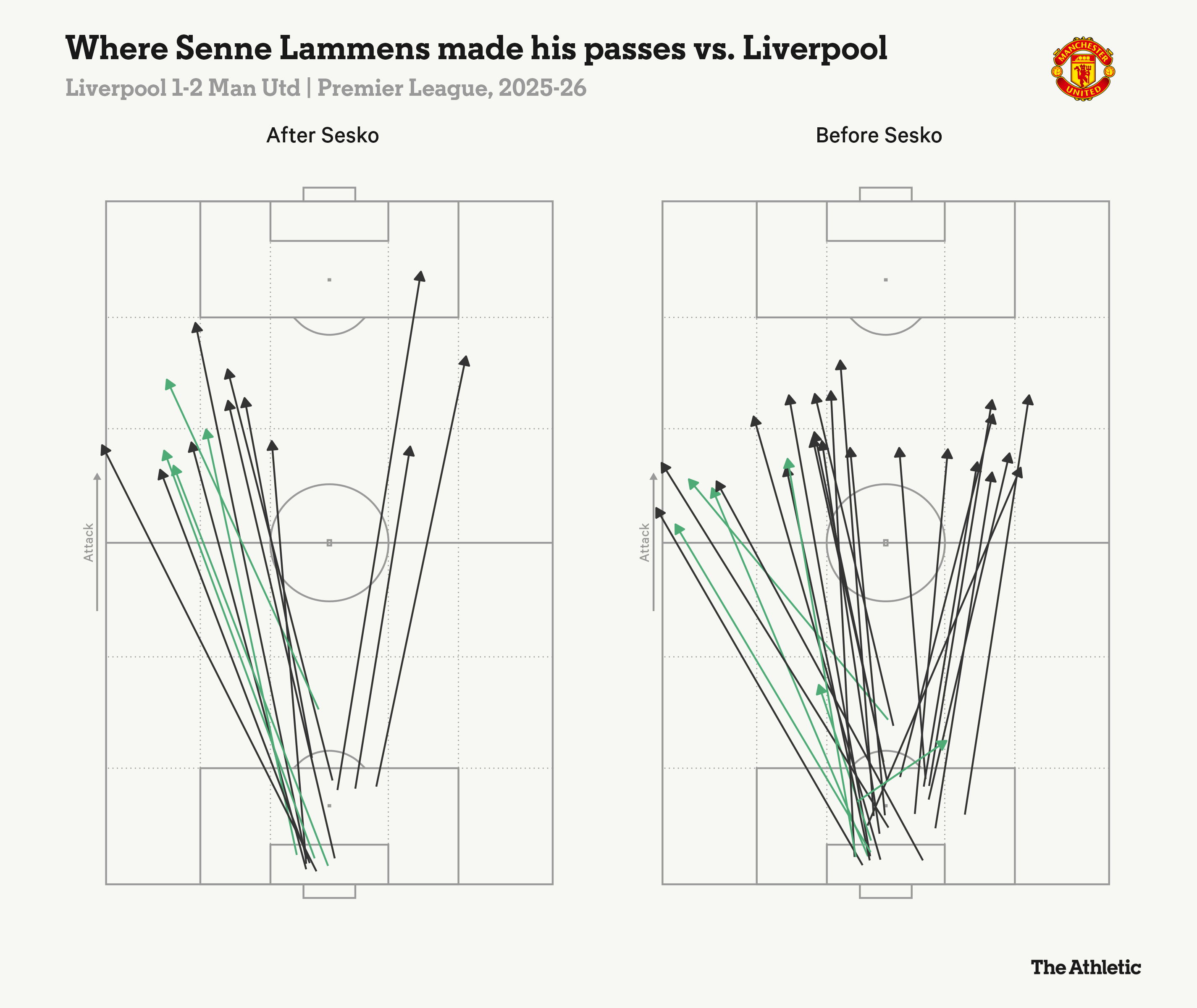 Однако показатель, лучше всего отражающий характер матча и подход «Юнайтед», — это 45 длинных передач Сене Ламменса (определяемых как передачи длиной не менее 32 метров, или 35 ярдов). Количество длинных передач, выполненных Ламменсом против «Ливерпуля» в воскресенье, стало самым большим показателем для вратаря Премьер-лиги за один матч с начала прошлого сезона.