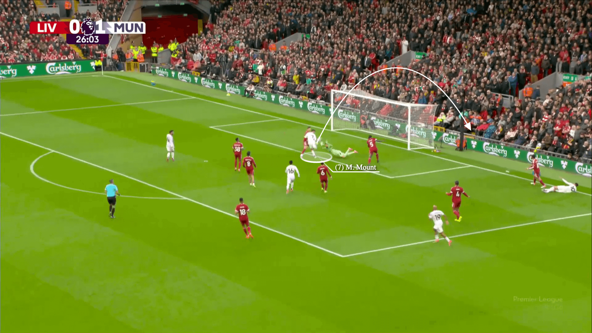… и, несмотря на то, что Георгий Мамардашвили перехватывает его прострел, Мейсон Маунт был близок к тому, чтобы удвоить преимущество «Юнайтед».