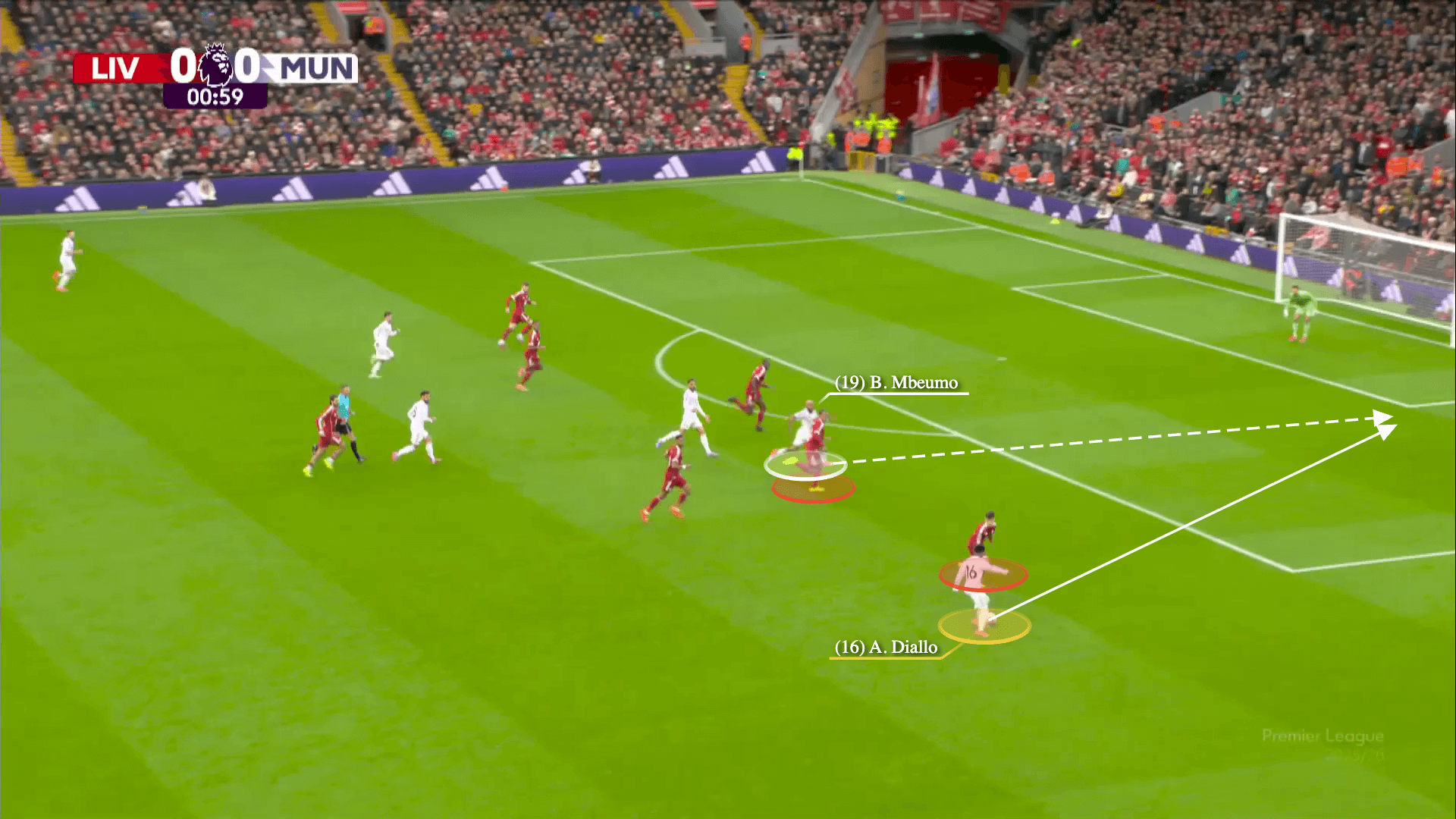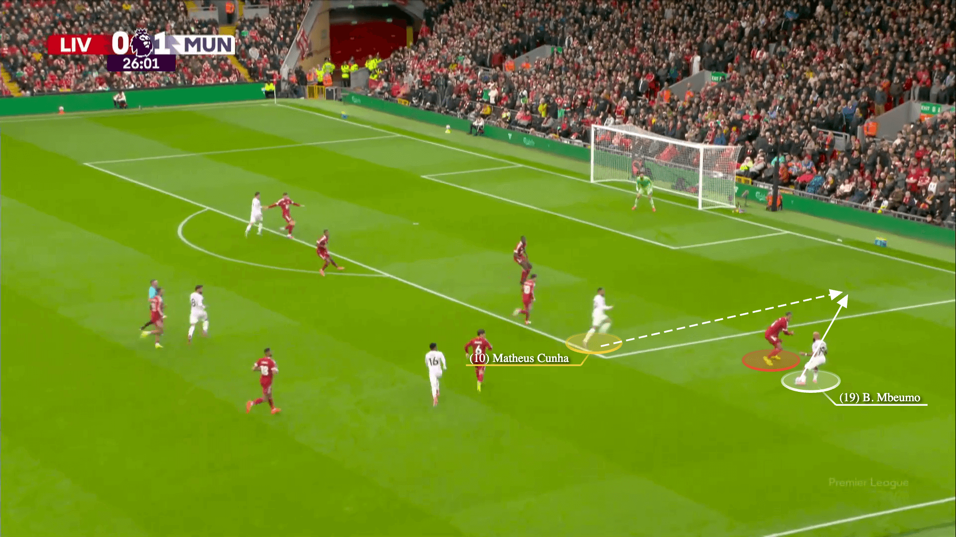Длинные передачи Ламменса направлялись на центрального нападающего «Юнайтед», противостоявшего Ибраима Конате и Собослаи, в то время как Кунья, переместившийся на левый фланг в роли «десятки», ожидал возможности атаковать второй мяч.