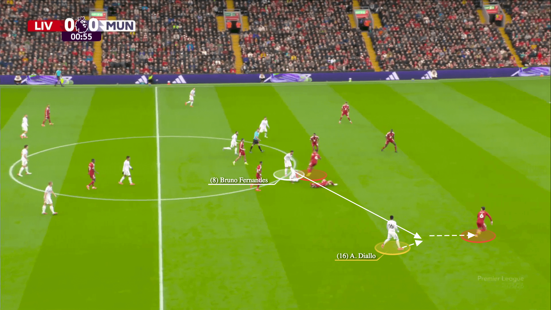 Во время этих верховых дуэлей Керкез сохраняет дистанцию от Амада, чтобы иметь возможность защитить пространство за спиной Ван Дейка. Когда Фернандеш выигрывает второй мяч, он переводит его на правого вингбэка «Юнайтед», чтобы использовать это преимущество.